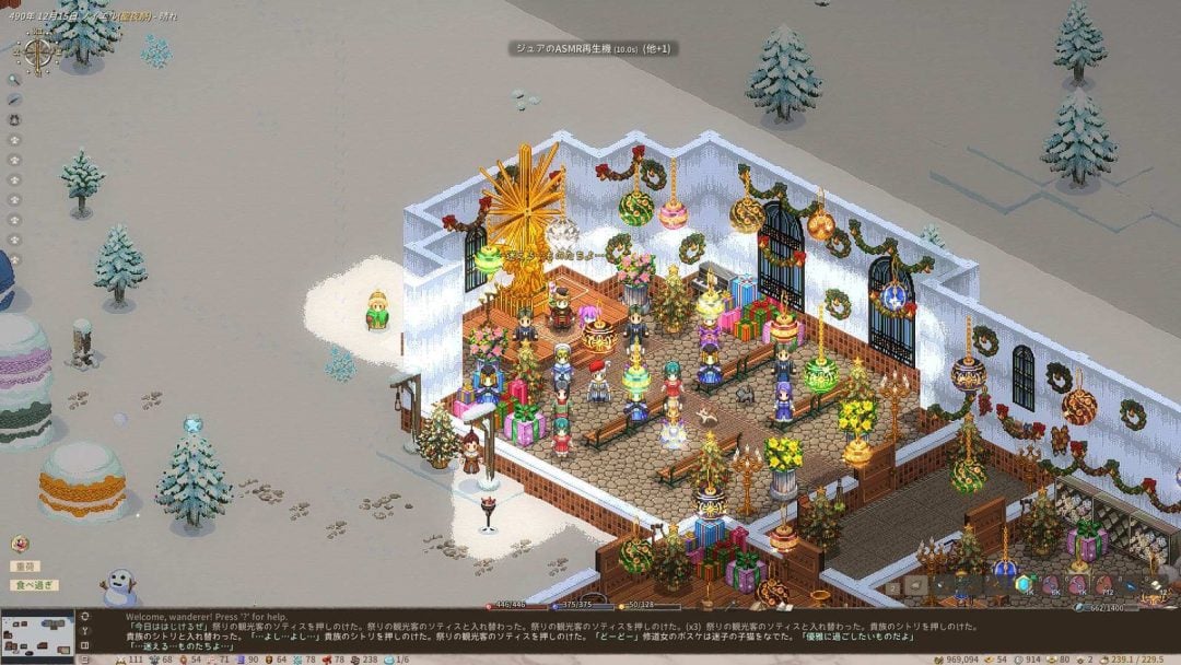 『Elin』ではゲーム内のボイスは存在していないため、「ASMR再生機」から流れる音声についても文字で表現されている。最初に実装されたASMRは『Elin』の世界で信仰されている女神の一柱《癒しのジュア》によるものだ。こちらは雪原の町ノイエルで毎年12月に開催される「聖夜祭」の飾り付けがアップデートで豪華になったことに伴い、聖夜祭期間中のノイエルの教会に設置されている。教会に行けば、集まった信者や観光客らを癒すジュアのASMR台詞を楽しむことができる。