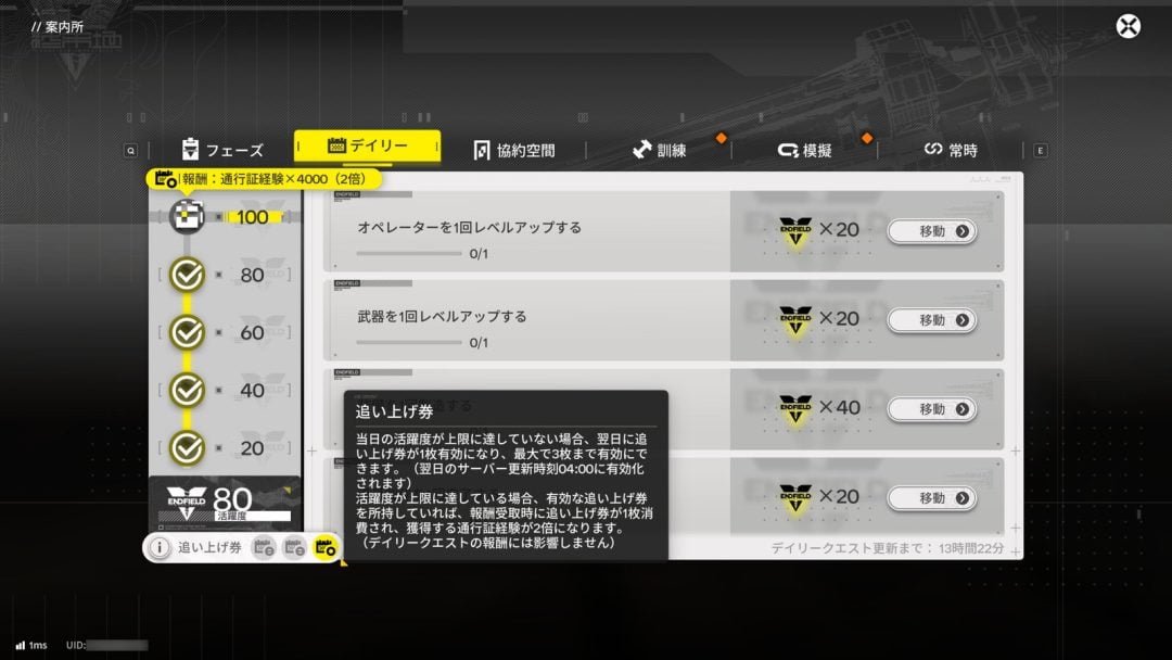 『アークナイツ:エンドフィールド』には「デイリーミッションができなくても、ちょっと取り戻せる」機能が存在。その名も「追い上げ券」