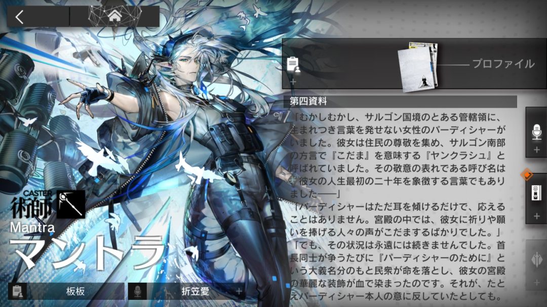 また、アルダシルの種族が、フィディアという種族であることも語られている。フィディアとは、蛇をモチーフとした種族である。共に行動しているネファリスは、ワニをモチーフとするアダクリスという種族だ。どちらもサルゴンに多く生息している点は、果たして偶然なのだろうか。先述した『アークナイツ』で登場する元パーディシャーのオペレーターであるマントラも、フィディア族なのだ。