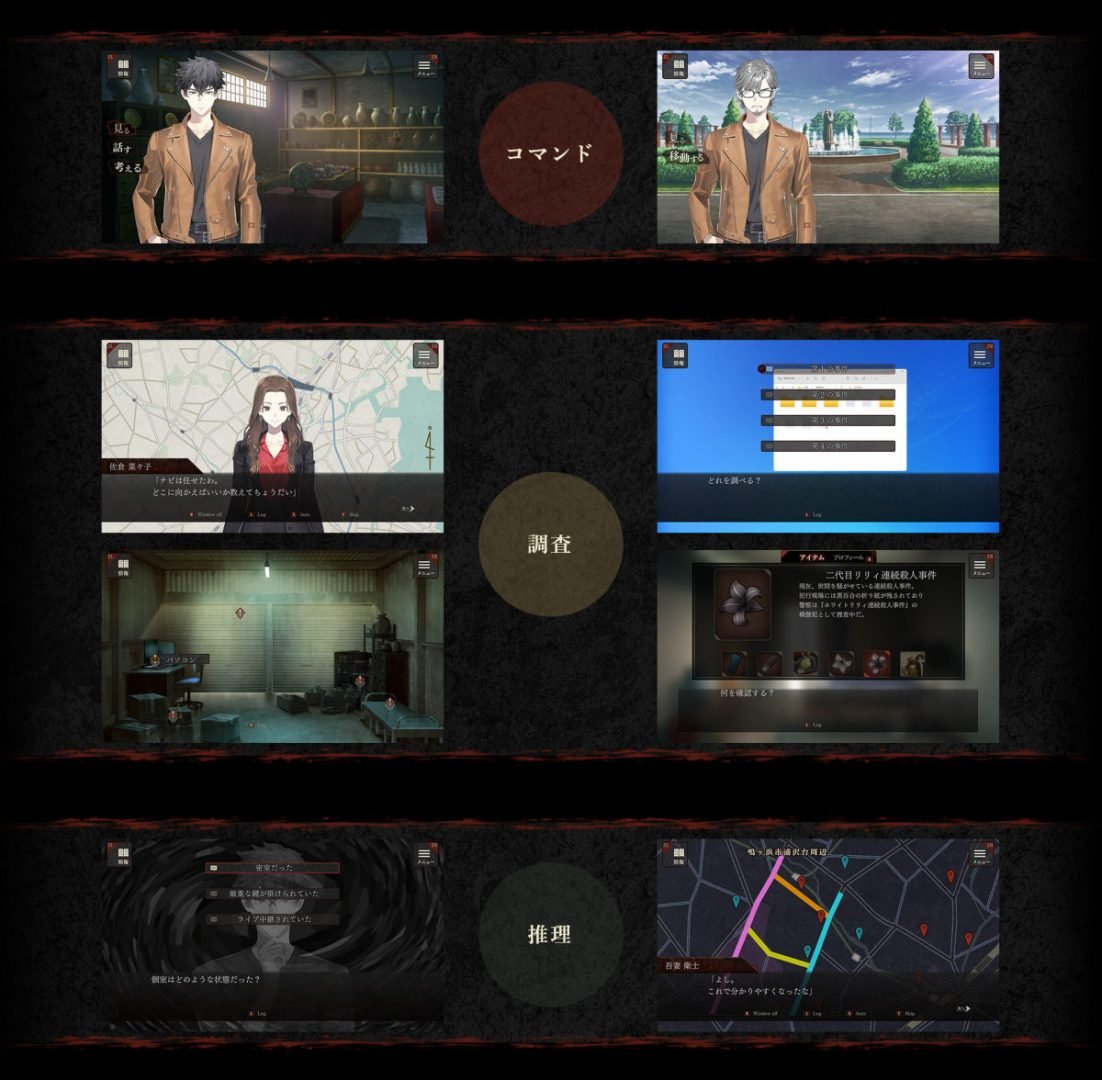 吾妻衛士は警察に追われているため、事件の調査を自由にできない。そこで彼は変装によって風貌を変えたり、協力者の力を借りたりしながら、証拠を見つけていくそうだ。画像を見る限り、本作ではコマンドによって、見る/話す/移動するといった行動を選択。調査中には画面上のポイントを調べたり、選択肢選んだりすることで、真相へと迫っていくようだ。コマンドによる調査などによって事件を解決し、冤罪を晴らそうとするのだろう。