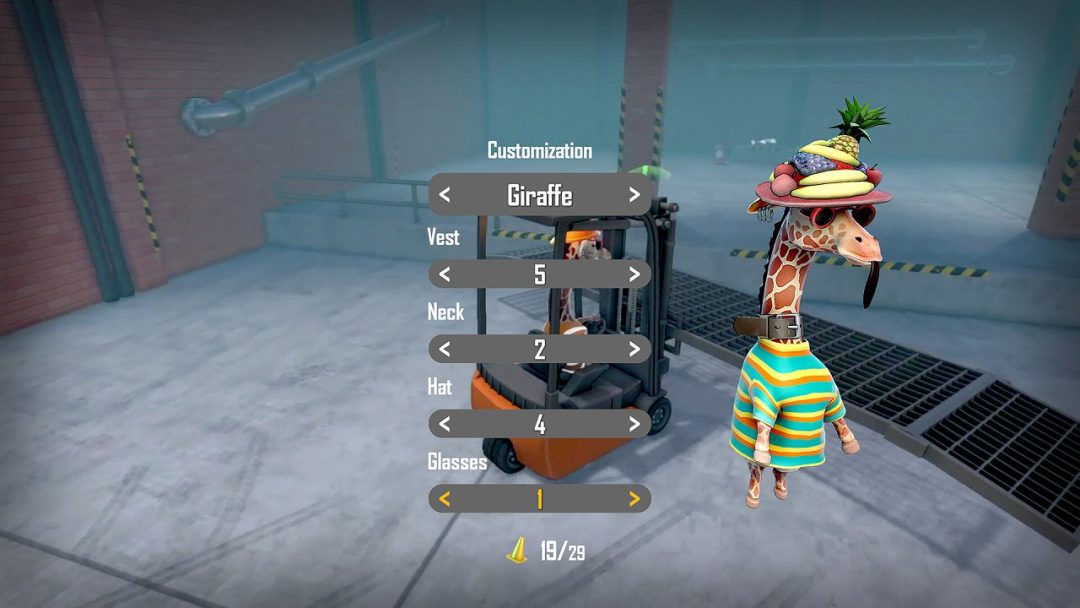 一方のキリンパートでは、キリンを操作して隙間をジャンプで越えたり、車両を乗り換えたり、ベルトコンベアやレバーといったギミックを操作したりしながらステージを進んでいく。またキリンの外見はカスタマイズができ、作業用ヘルメットやウサ耳、フルーツといったさまざまなアクセサリーを装備可能だ。こうしたキリンを操作するアクション要素と、フォークリフトを操作するシミュレーション要素の2つで構成されている点が、本作最大の特徴といえるだろう。