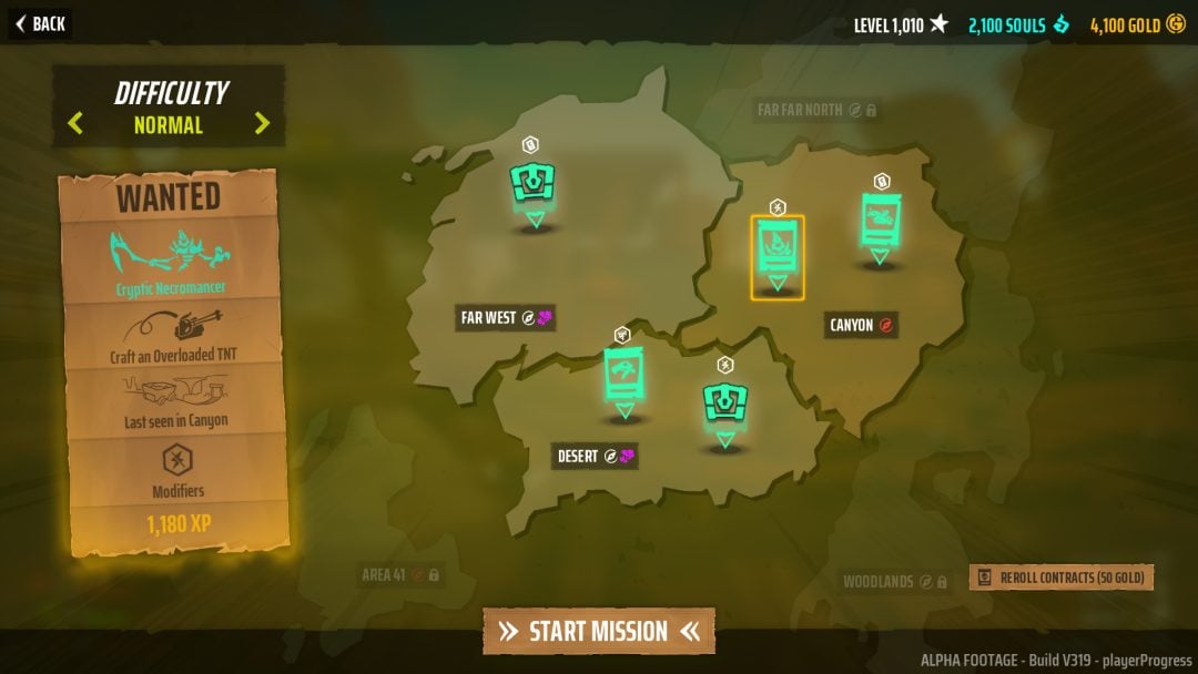 今回のプレイテストではシステム面を中心に複数の変更が加えられており、従来はリスト形式だった契約選択画面が、ワールドマップ形式へと刷新。マップ上で各契約の位置関係や詳細を確認しながら、出撃先を選択する流れとなっている。また「Modifiers」と呼ばれる要素も導入され、契約に特殊な効果や制限の付与が可能。Modifiersを適用した契約では獲得経験値が増加するため、リスクとリターンのバランスに悩む場面も出てきそうだ。
