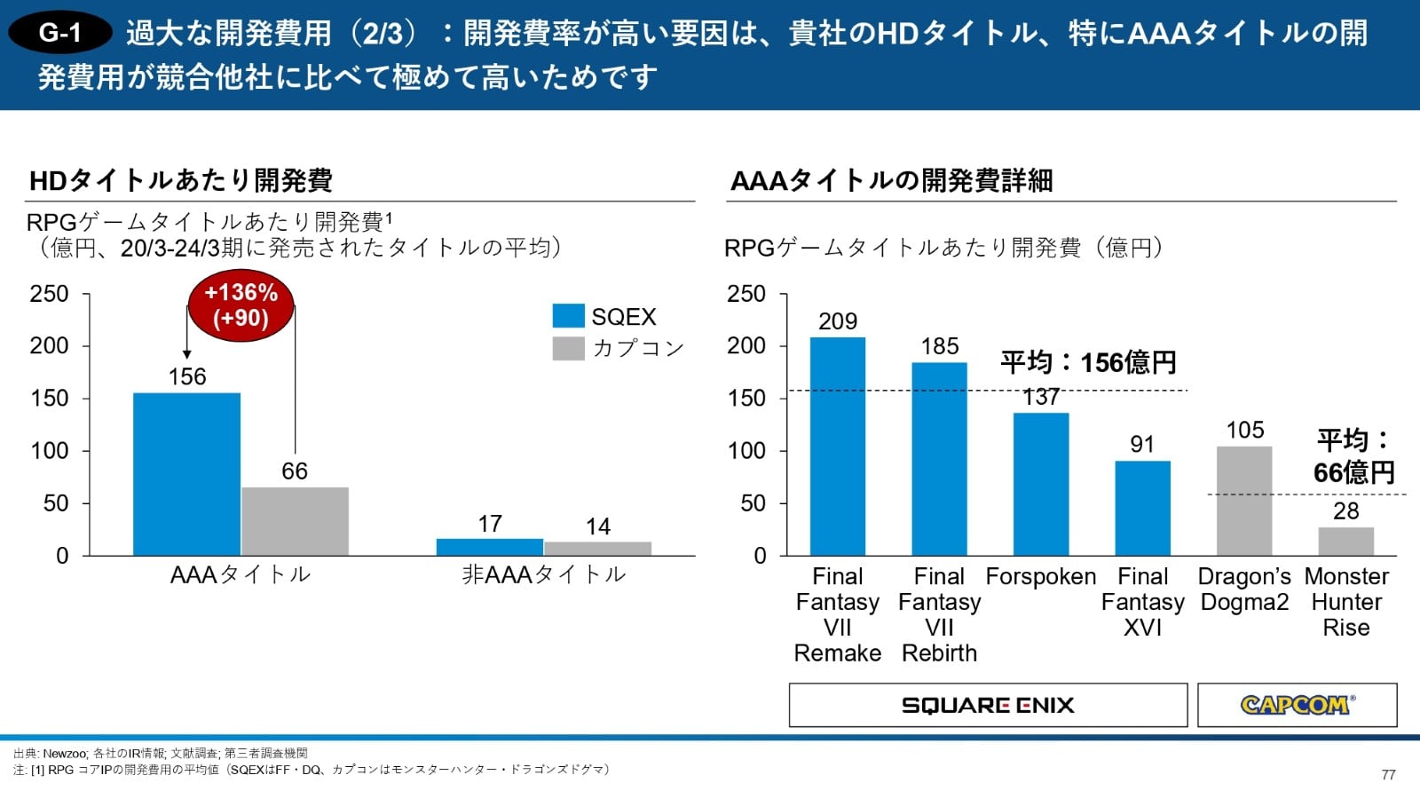 ちなみに資料においては、同じく第三者調査機関のデータに基づくとみられるカプコンの一部タイトルの開発費との比較も実施。これによれば、『ドラゴンズドグマ2』は105億円、『モンスターハンターライズ』は28億円とのこと。2020年から2024年までの“RPGコアIP”の平均開発費の比較もおこなわれており、AAAタイトルではスクウェア・エニックスは上述した4タイトルの平均で156億円、カプコンは上述した2タイトルのみからの平均で66億円となっている。“RPGコアIP”かどうか、AAAタイトルかどうかといった分類は3Dインベストメント・パートナーズが独自に決めているようで、ざっくりとした比較でスクウェア・エニックスのAAAタイトルの開発費が競合他社と比べて過大であると指摘する内容になっている。