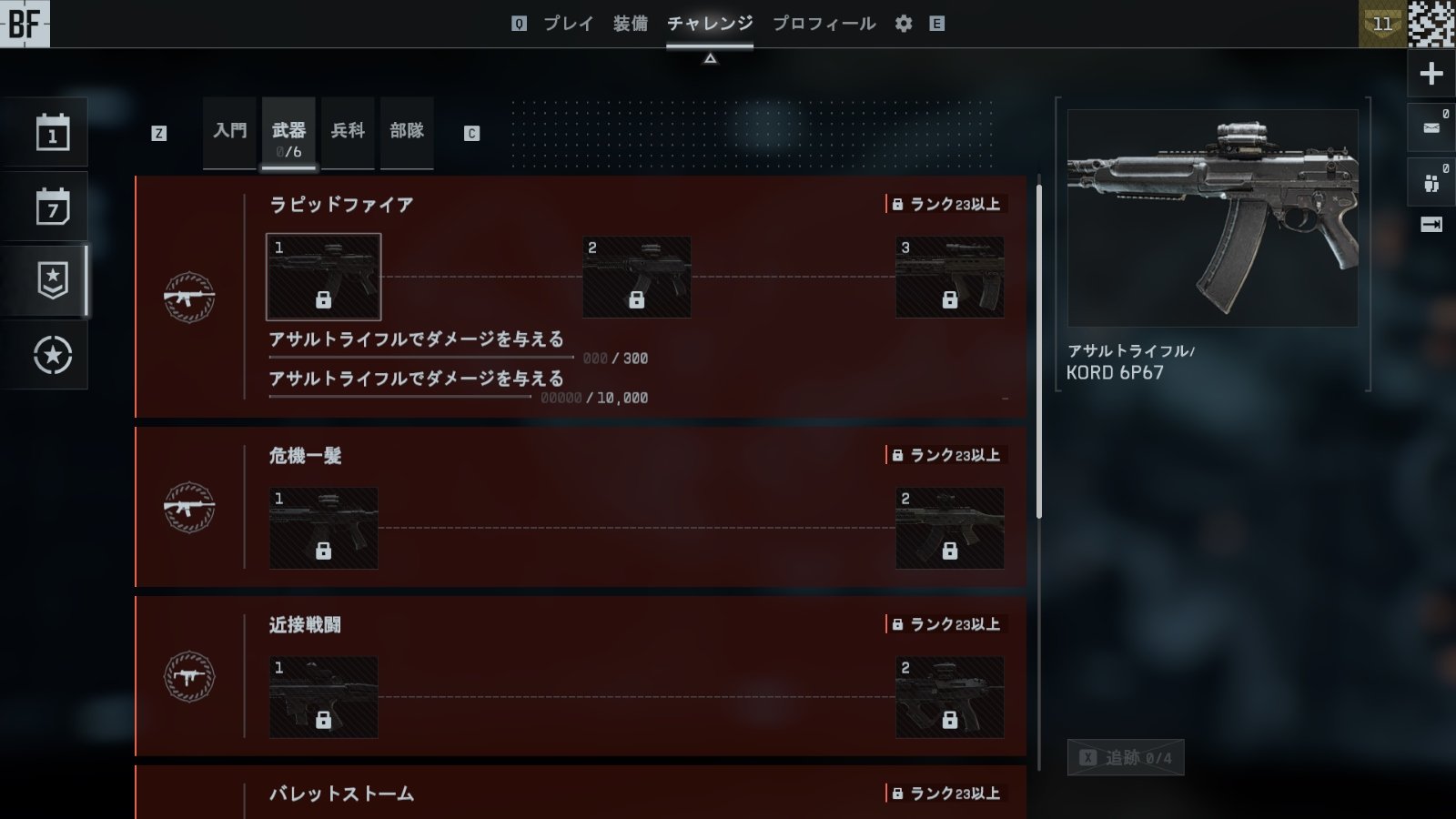 たとえば、LMGの「KTS100 MK8」を開放するためのチャレンジ「バレットストーム1」では、「LMGで300体の敵を制圧」と「LMGの腰撃ちで1万ダメージを与える」という2つのタスクをこなす必要がある。どちらも手間がかかるが、そもそもランク23にならないとキル数やダメージ数は加算されない。