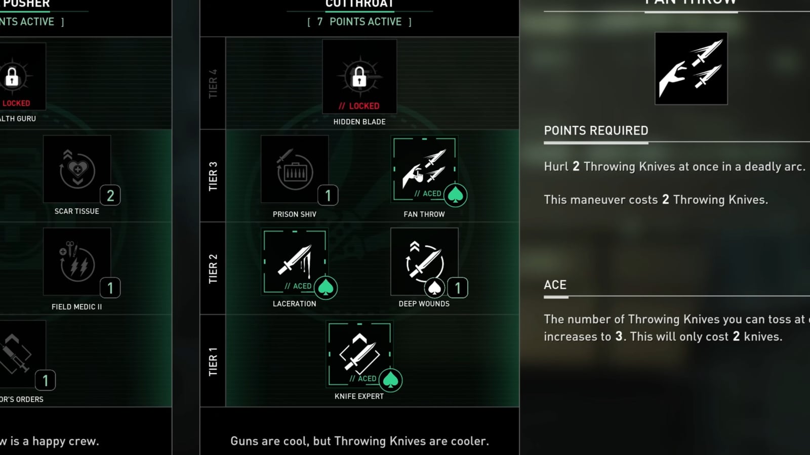 新たに実装されたSkills 2.0ではスキルツリーとして戦闘向けのSoldier、隠密向けのNinja、セントリーやショットガン向けのMechanic、ECMジャマーやギミックを多用するHacker、アドレナリン消費による一撃必殺攻撃可能なConman、遠距離戦闘向きのProfessionalなどが用意されている。それぞれのツリーにはサブツリーが存在し、Tier 1などの下位スキルから取得していく形式だ。特定のサブツリーに一定ポイントを投資することで、上位Tierのスキルが順次アンロックされていく。スキルポイントは最大51ポイント獲得可能で、これはプレイヤーのインファミーレベル150到達時の最大値となるようだ。