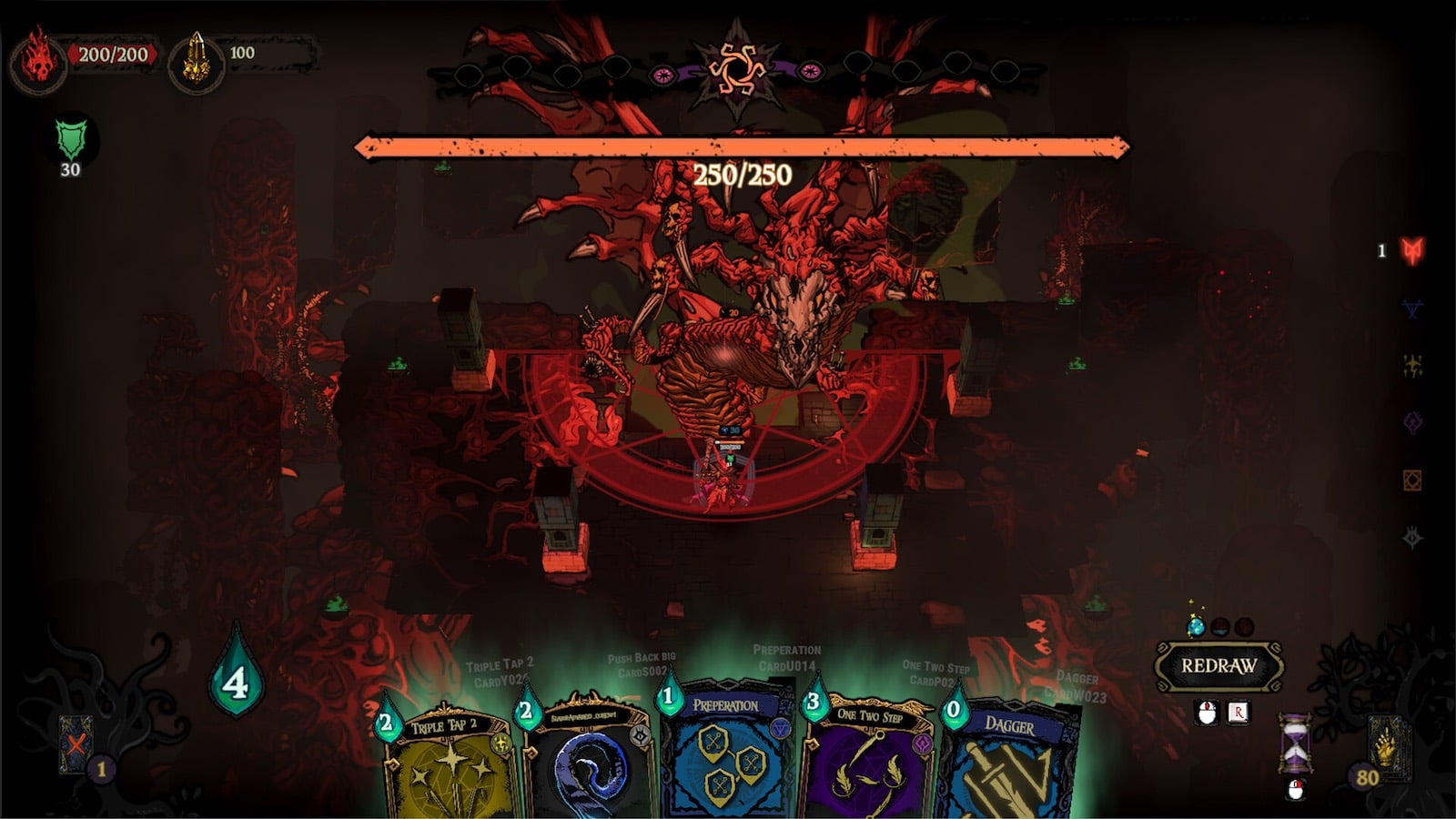 ダンジョンの構成や出現する敵、入手できる宝物はプレイするたびにランダムとなり、部屋で敵とのバトルをこなしては、さらなる部屋へと進んでいく。バトルでは基本的に複数のモンスターが同時に現れ、プレイヤーはデッキから引いたカードを駆使して戦うのだ。リアルタイムで進行する中で、素早く戦略的に判断することが求められるゲームプレイとなる。