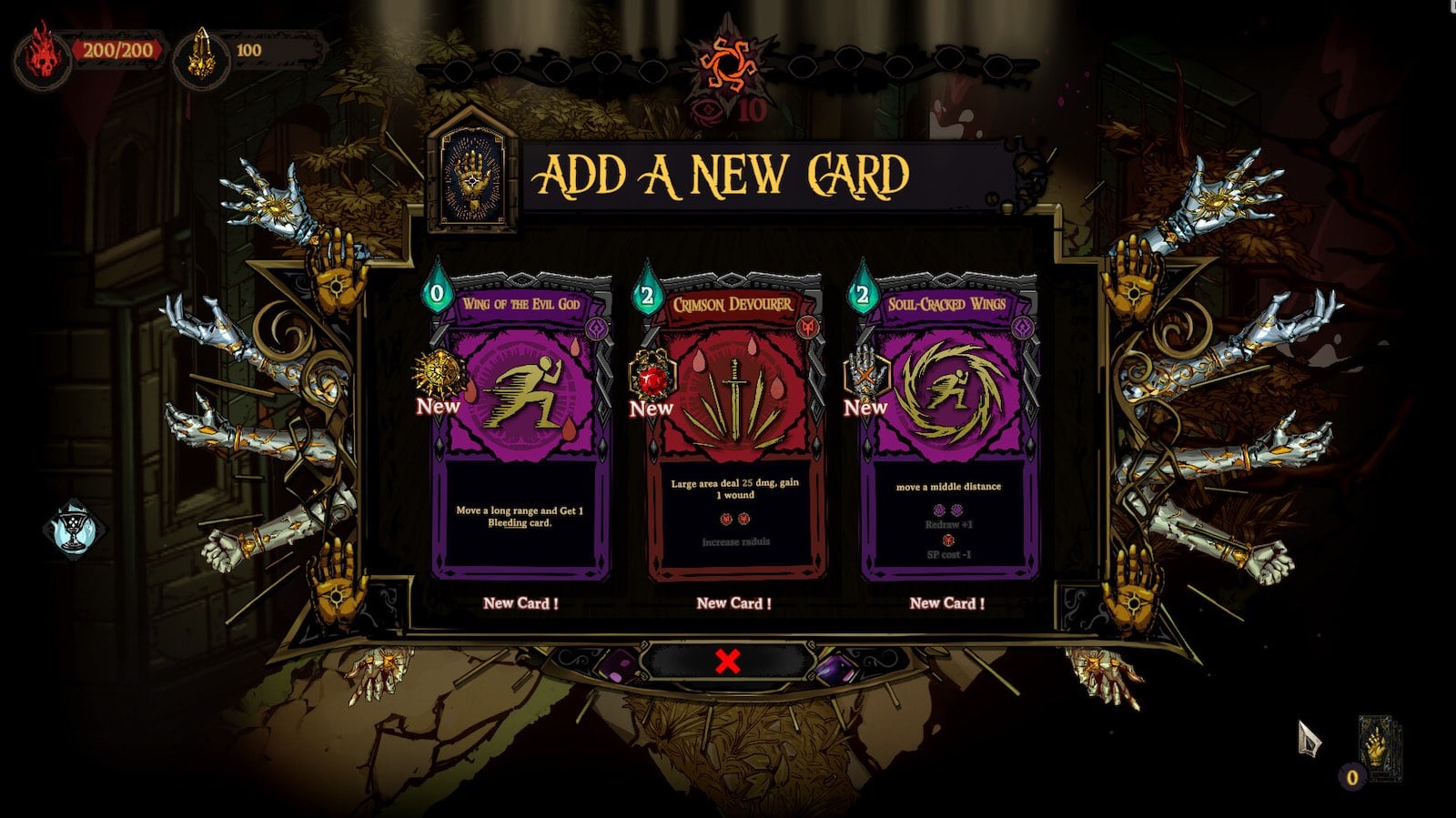 バトルに勝利すると、報酬として新たなカードを入手でき、次なるバトルの部屋へと進む。その際には複数の扉が用意され、バトル報酬のカードのカテゴリをあらかじめ選択可能だ。またバトルに向かう前には、ショップを訪れたりイベントをこなしたりできる。イベントは、カードやお金、強化アイテムなどを入手できる機会となり、デッキからランダム引いたカードの種類によって成否が決まる仕組み。一方で、イベントをおこなうたびに堕落値が上昇し、予測不能な効果やストーリーの展開を引き起こすことにつながる。
