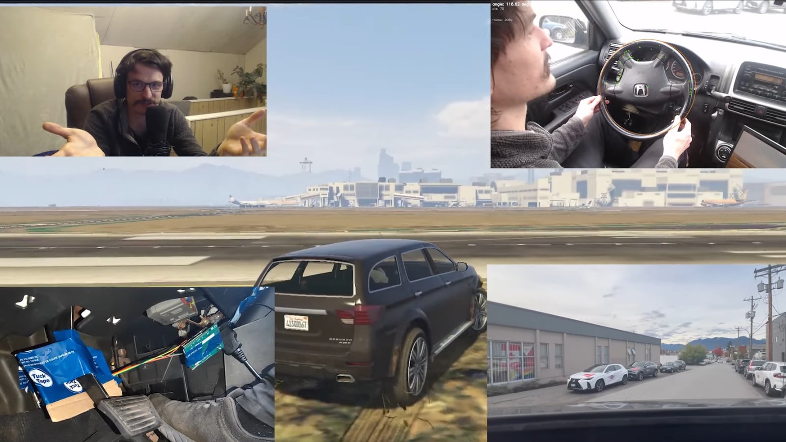 そしてテストを重ね、ついにデバイス一式が完成した。ブレーキ用のセンサーとハンドル用のカメラ、そしてOBDポートからのケーブルをともにUSBでノートパソコンに接続。そして肝心の『GTA V』を起動していざアクセルを踏み込む。見事アクセルとブレーキ、そしてハンドルの操作をゲーム内の車と連動させることに成功したのだ。なお、AT車などにおいてアクセルを踏んでいなくても進む「クリープ現象」を再現するために、ゲーム内では常に少しの加速がかかるようにするといった調整もおこなっているとのこと。