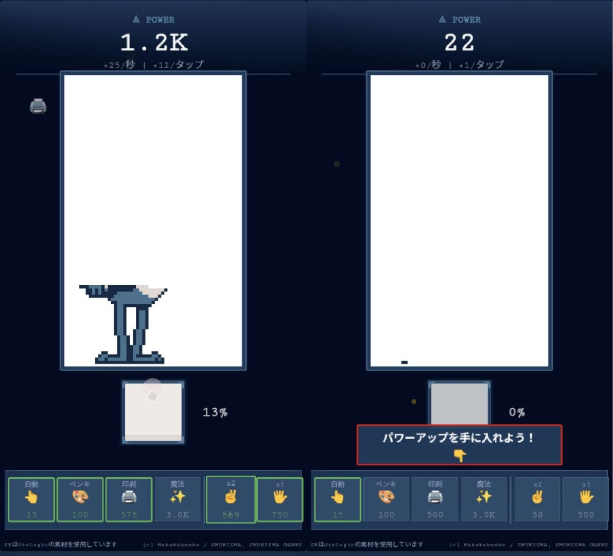 本作でプレイヤーは、画面下側に配置されたドットをタップすることで、目標の達成を目指していく。ドットをタップしていくと、パワーが増加して画面最下部よりパワーアップが購入可能。自動的にパワーを増やしてくれる自動/ペンキ/印刷/魔法、タップ時に効果を増加させる×2/×5によって、ゲームプレイの効率を上げられる。パワーアップの購入によってゲームプレイの効率を上げながら、100%の達成を目指すのだ。基本的な仕組みとしては、いわゆるクリッカーゲームそのものと言っていいだろう。