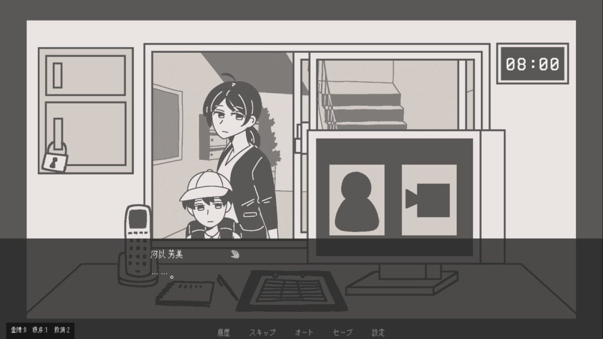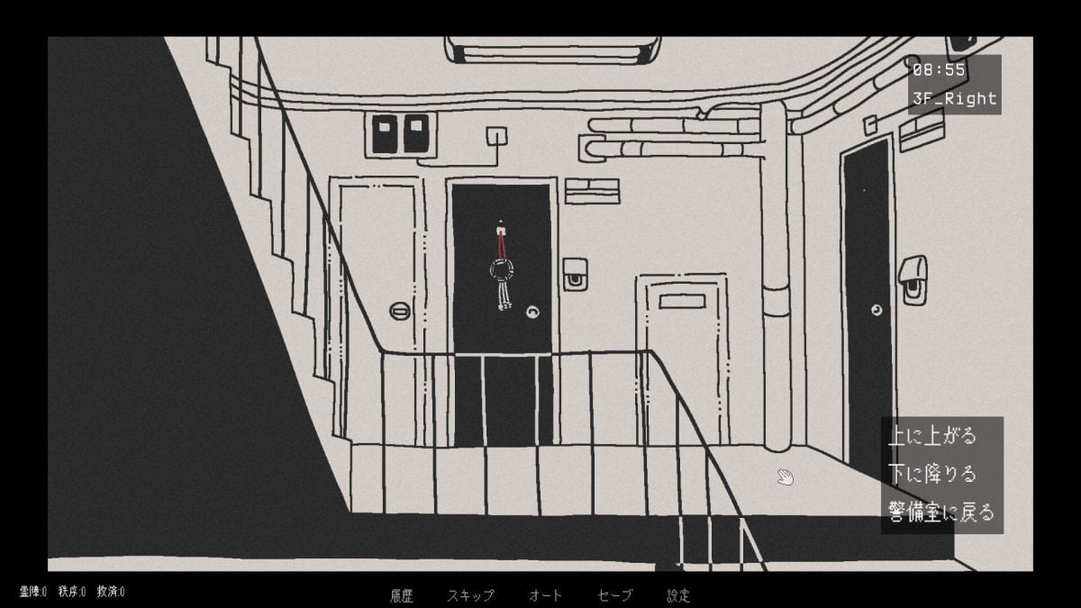 また巡回やモニターの監視も重要な業務である。警備室には防犯カメラのモニターが設置されており、アパート内の1階から屋上まで、各階の様子が確認できる。リアルタイムに時間が経過していく中、モニターで定期的に映像をチェックし、異常があった場合には適宜現場へ向かい、トラブルなどにも対応していく。15時には、定期巡回も実施する決まりとなっている。ここまでは、一見普通の警備業務のようにも思える。しかし柘榴団地には、白装束の女性が出現することがあり、彼女には絶対に声をかけてはいけないのだという。もし白装束の女性に声をかけてしまうなど、警備員がルール違反をしてしまうと、霊障レベルが上昇。霊障レベルが上がると霊障が発生し始め、画面にも影響をおよぼし、レベル5を超えるとプレイヤーは行動不能になってしまう。本作では霊障レベルが上がりきらないように、いわくつきのアパートでの警備業務を進めていくのだろう。