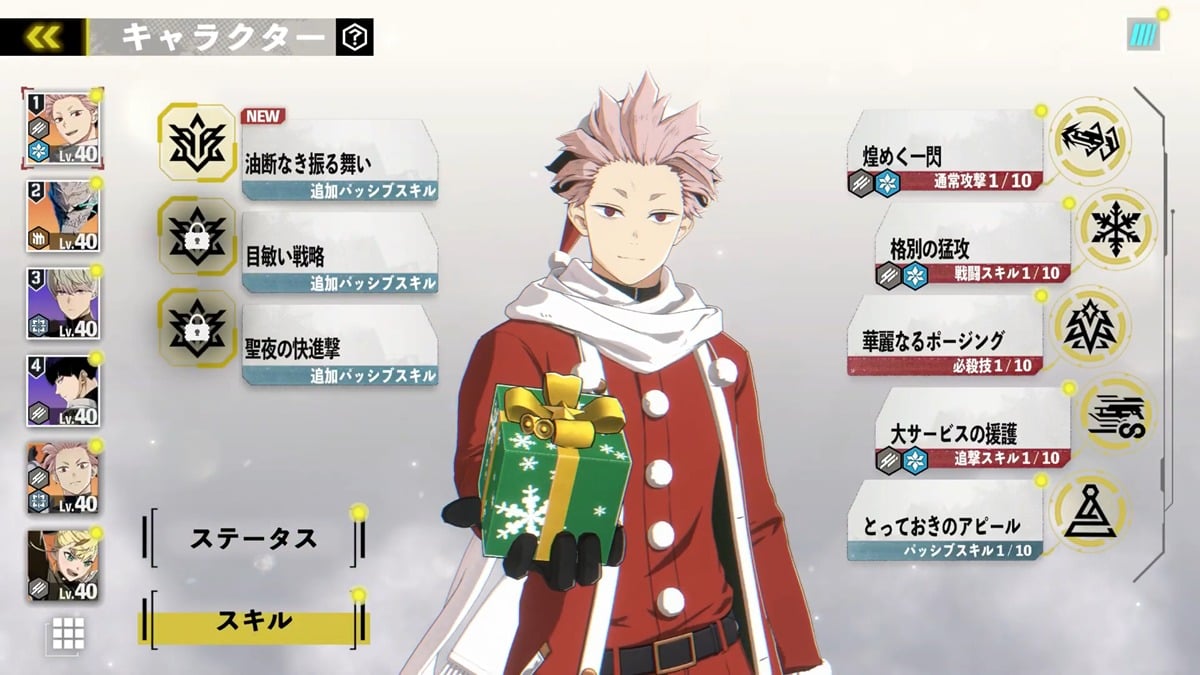 そんな彼が、防衛隊主催のクリスマスイベントに全力で臨むためにサンタ衣装で登場したかたちである。性能としては、斬属性と氷属性の2属性をもつキャラクターで、自身をバフするパッシブスキルと必殺技も習得している生粋のアタッカーとなっている。なお、彼の最適武器種である銃剣の★5武器「GS-Xmas25」もあわせて実装されている。こちらは赤と白のカラーリングが目を引く、クリスマスらしいデザインの銃剣となっている。