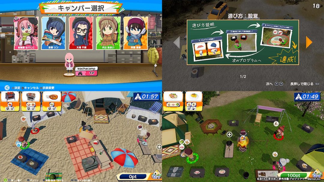 『ゆるキャン△ みんなでワチャワチャ!キャンピングクック!』は、ソロプレイおよび最大4人でのローカル・オンライン協力プレイに対応。プレイヤーは「ゆるキャン△」の世界を舞台に、なでしこやリンたち原作でおなじみのキャラクターを操作してプレイする。なお、主要キャラクターのボイスはアニメ版と同じ声優陣が担当している。