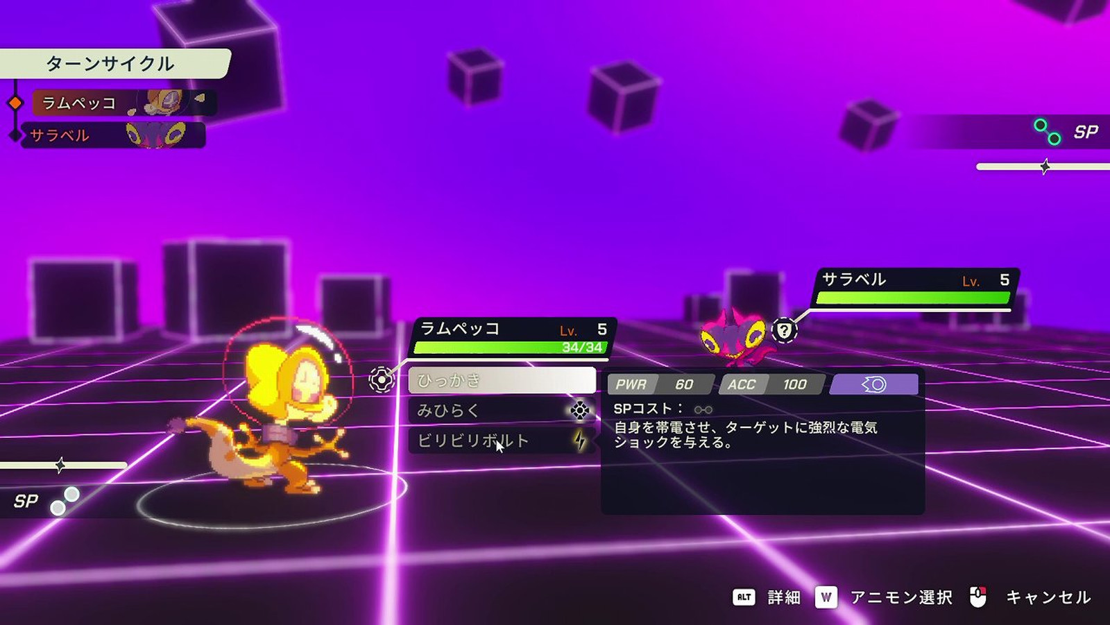 そうして捕獲したアニモンは、野生アニモンとの戦闘やほかプレイヤーとの対戦に参加させることができる。本作の戦闘はターン制で、1対1に加え4対4のパーティ戦も存在。行動順はアニモンのステータスによって決まり、コストを支払うことでスキルの発動、アイテムの使用、アニモンの交代などの行動を選択できる。