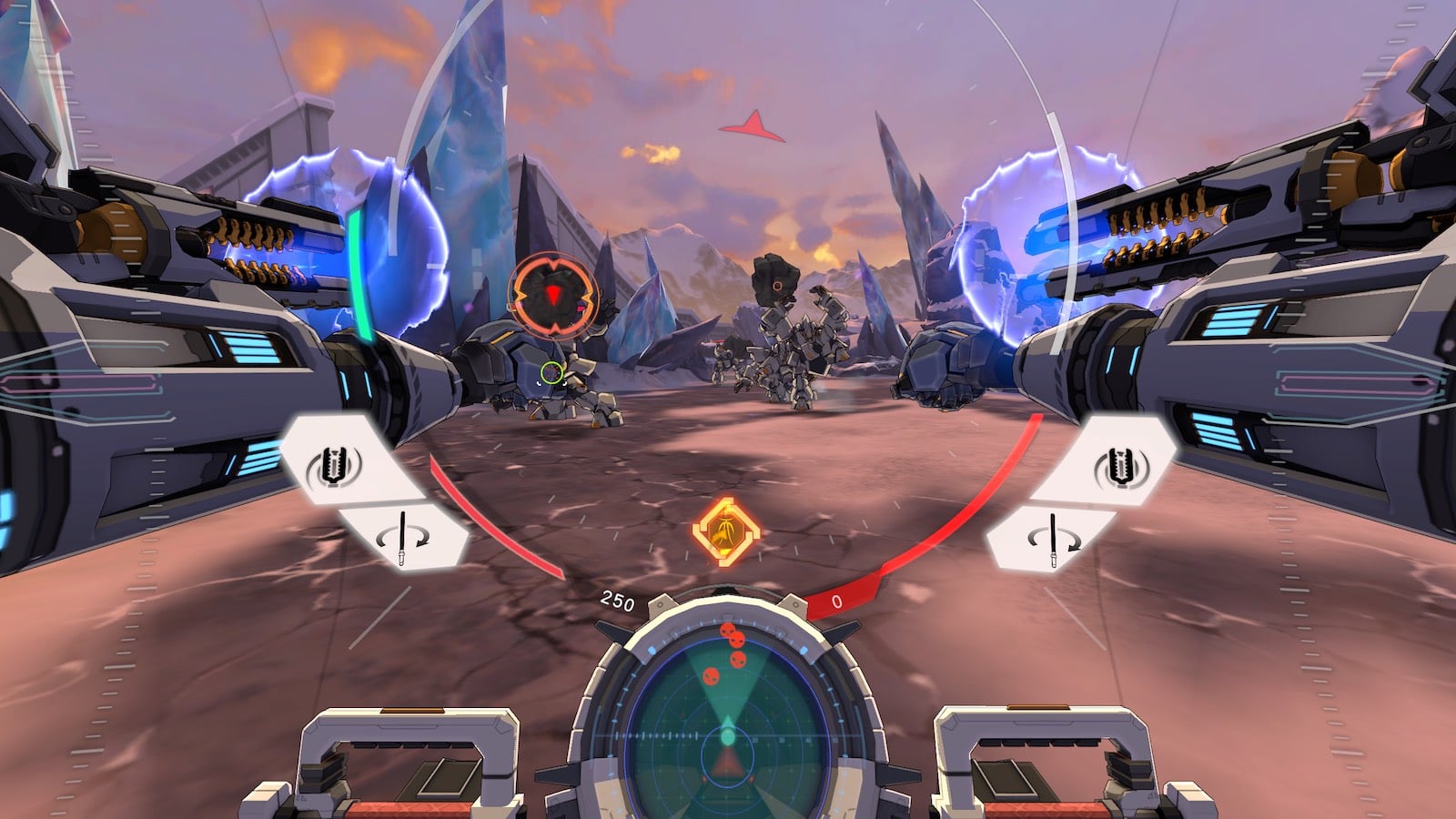 ステージはプレイするたびにランダムとなり、多数の敵ロボットがウェーブ制にて出現。人型ロボットからドローン型までさまざまなタイプが存在し、その武装もさまざま。シールドを装備するタイプもいる。そして敵をすべて倒してクリアすると、戦果に応じて獲得したポイントを使って装備のアップグレードを入手し、次のステージへと向かう流れとなる。