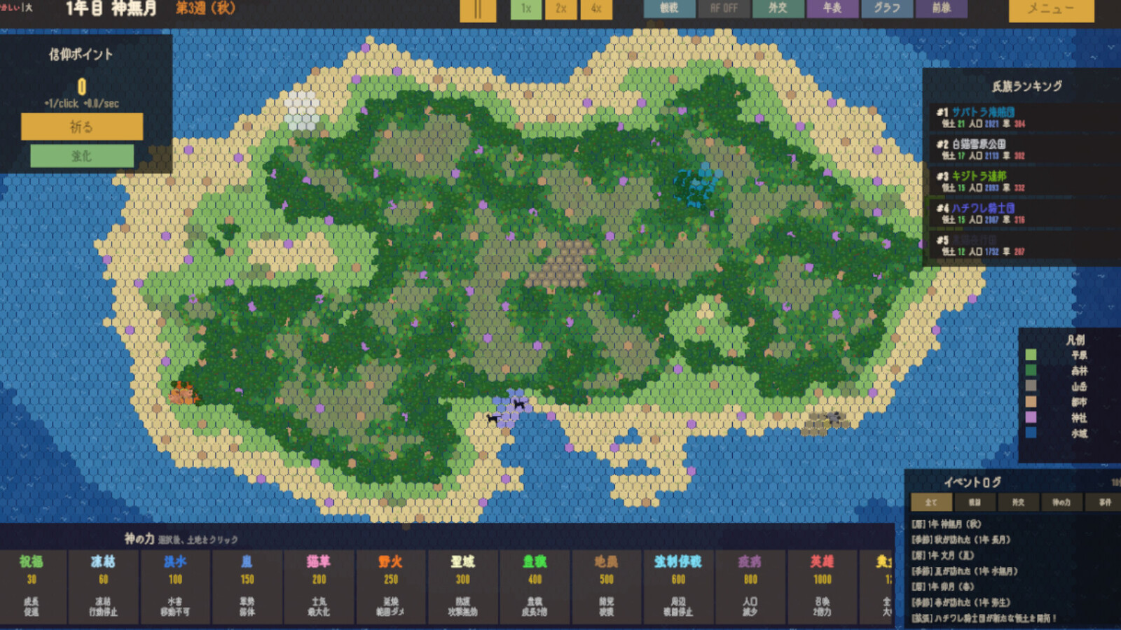 プレイヤーが使用できる「神の力」には、祝福や英雄召喚などの猫たちを支援するものが存在。そのほか、嵐、地震、疫病、隕石などの猫たちに被害を与える天災も使用可能だ。さらには強制停戦や、同盟を破壊する裏切り、領土反乱を引き起こす革命といった世界に混乱を起こすものなど、多彩なものが用意されているという。お気に入りの猫たちに天下統一させるために使うか、世界を混乱に突き落とすかはプレイヤー次第だ。