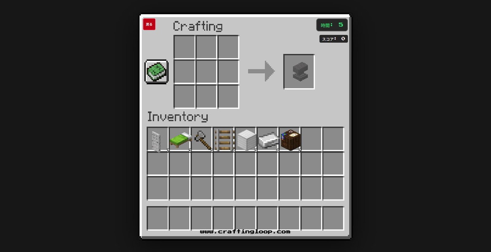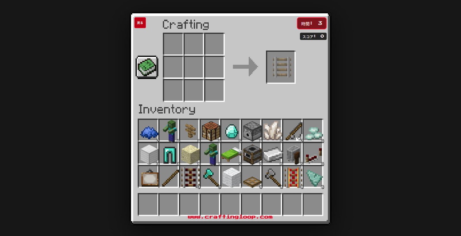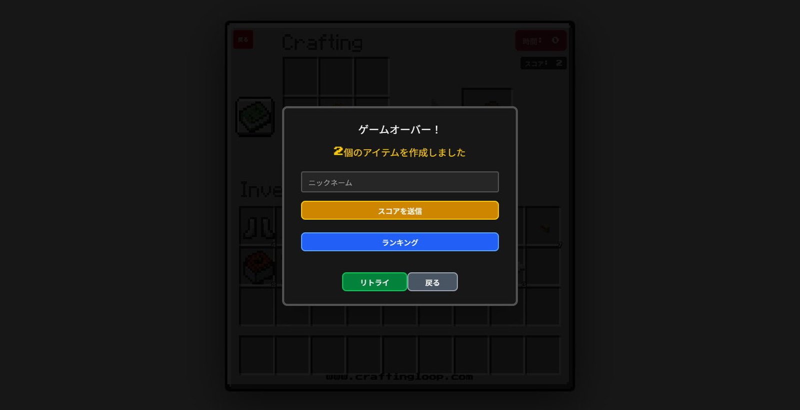 『Crafting Loop』は、『マインクラフト』のクラフト(アイテム作成)を素早くおこなうブラウザゲームである。ゲームを開始するとさっそくカウントダウンがスタート。9×9の作業台のグリッドに素材となるアイテムを並べ、制限時間内にお題となっているアイテムをクラフトできれば次のクラフトへと進み、時間切れになったらゲームオーバーとなる。プレイヤーはできるだけ多くのアイテムをクラフトすることを目指す。なお、与えられるアイテムやお題はランダム。現在の『マインクラフト』ではレシピ本からアイテムの配置を呼び出すこともできるが、本作では手動でアイテムを配置してクラフトしていた昔ながらの『マインクラフト』知識が試されるというわけだ。