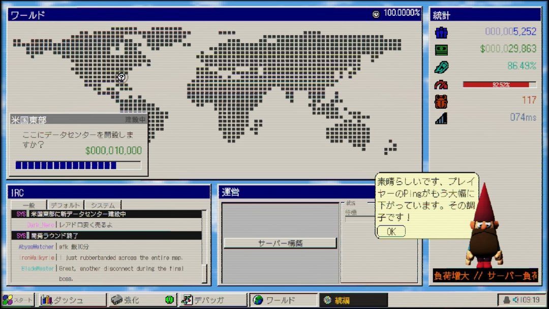 プレイヤーがリリースしたMMOは、時間経過で自動的に売り上げを伸ばしていく。しかし、そのまま見ているだけではいずれ収益は頭打ちになってしまう。ユーザー数が増加すれば、いずれサーバーは収容限界を迎えてしまい、負荷の重さにユーザーからの不満も高まっていく。負荷が高まってきた頃合いを見計らい、新たなサーバーを構築する必要があるのだ。また、海外からのユーザーが増えた際には、国外に新たなデータセンターを開設しなければならない。人員を配置し、地域ごとにサーバーを管理させることが重要になる。