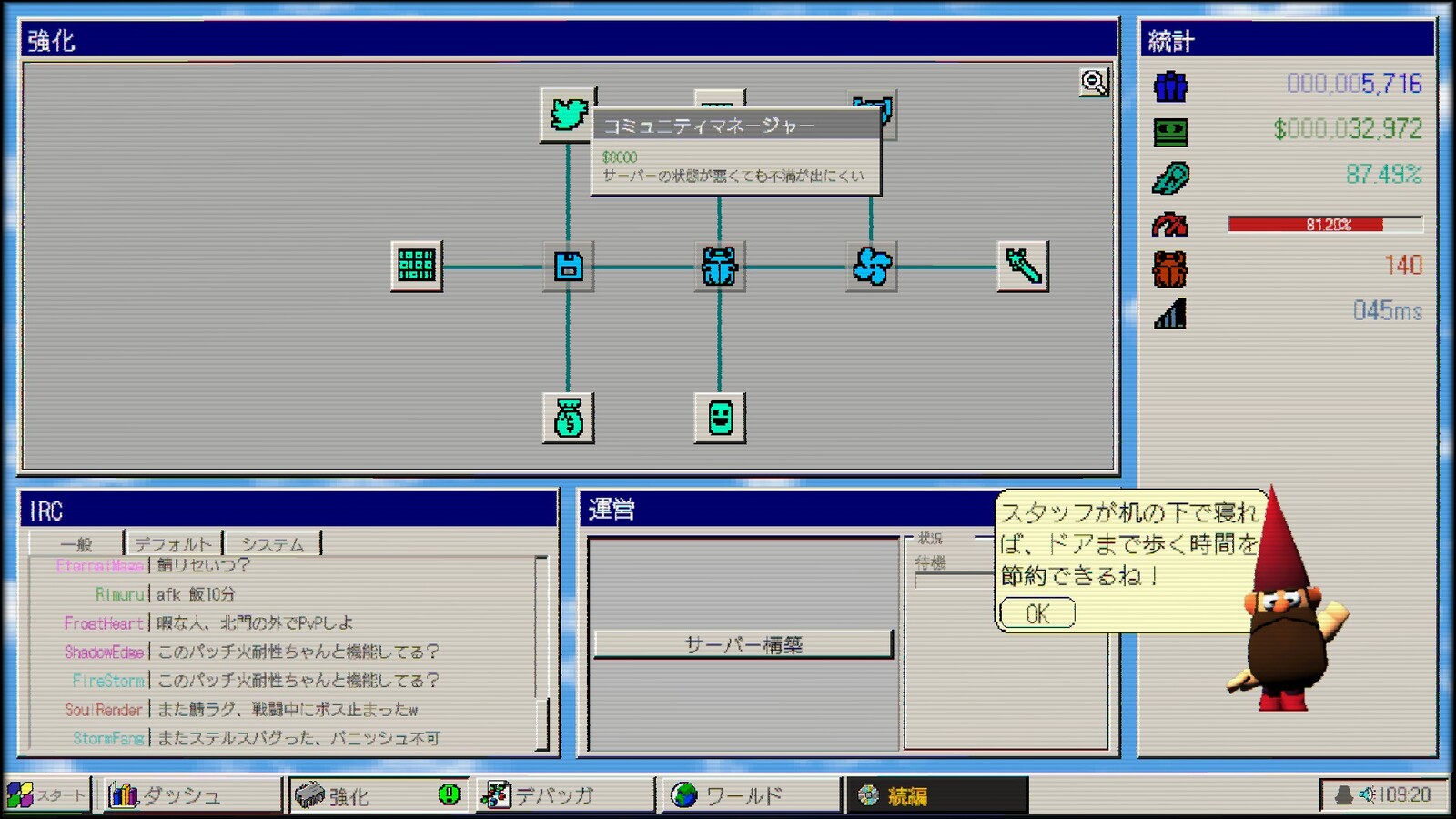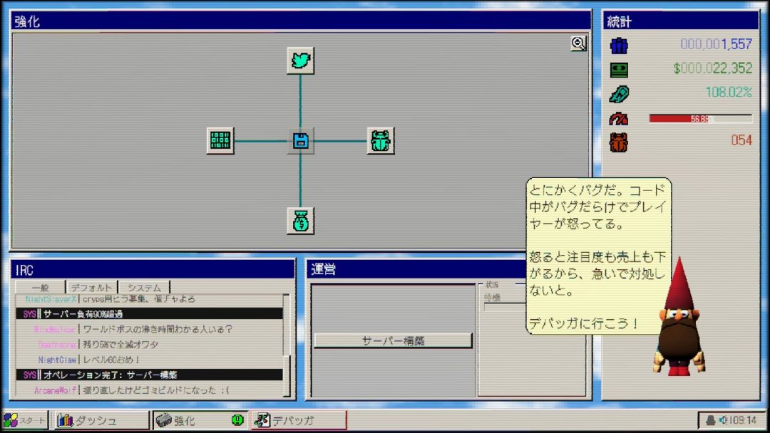 レトロOS風・MMO運営放置系シム『MMO98』4月20日リリースへ。MMO世界市場制覇を目指し、サーバー管理や“愚痴の対応”に奔走