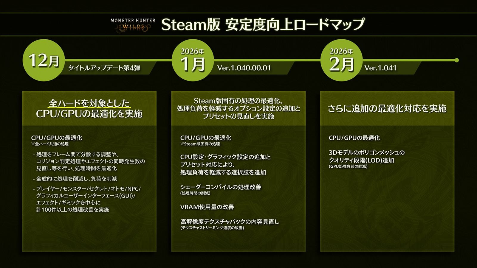 Steam版向けの安定度パッチは3回を予定しており、まず12月16日のタイトルアップデート第4弾にて、CPU/GPUの最適化(全ハード対象)や、Steam版向けに処理時間の最適化、負荷の軽減などがおこなわれる。1月には処理負荷を軽減するグラフィック設定の追加やシェーダーコンパイルの処理時間削減、VRAM使用量の改善などが実施予定。2月にはGPU処理負荷軽減を目的としたポリゴンメッシュのLOD段階追加が実施され、段階的に安定度が向上する見込みだ。