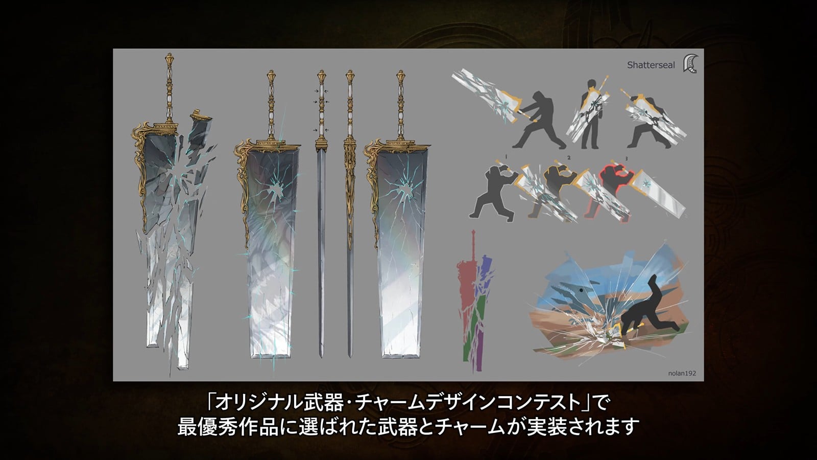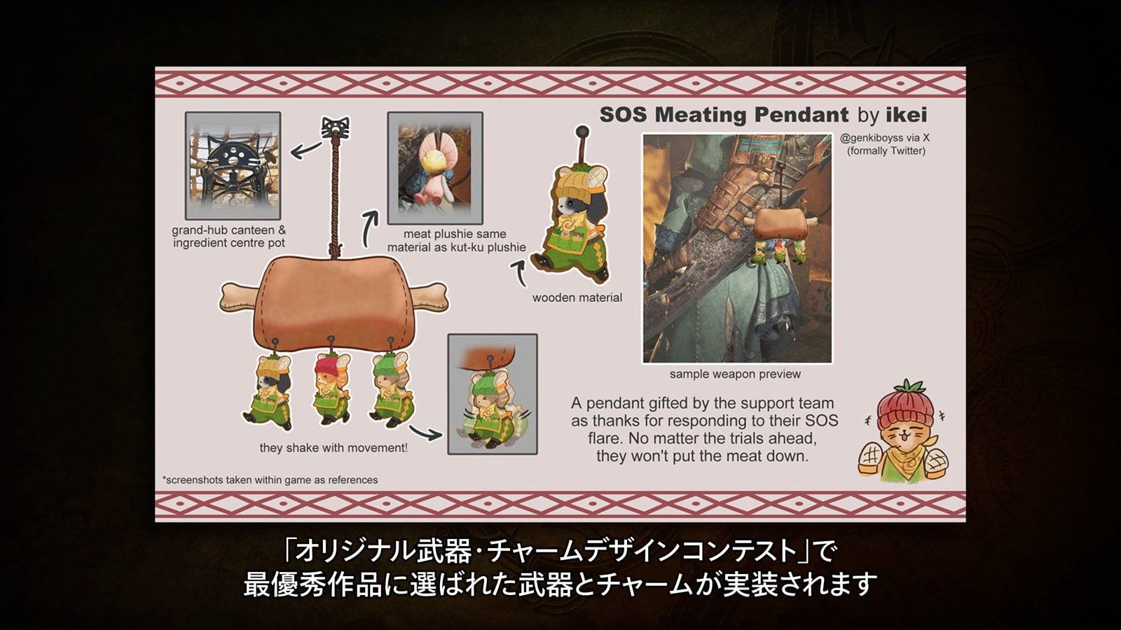 また、以前開催された「オリジナル武器・チャームデザインコンテスト」にて、最優秀作品に選ばれた武器とチャームが実装される。割れた鏡のような相貌の大剣や、こんがり肉を運ぶかわいらしいアイルーたちをモチーフにしたチャームが手に入るようだ。