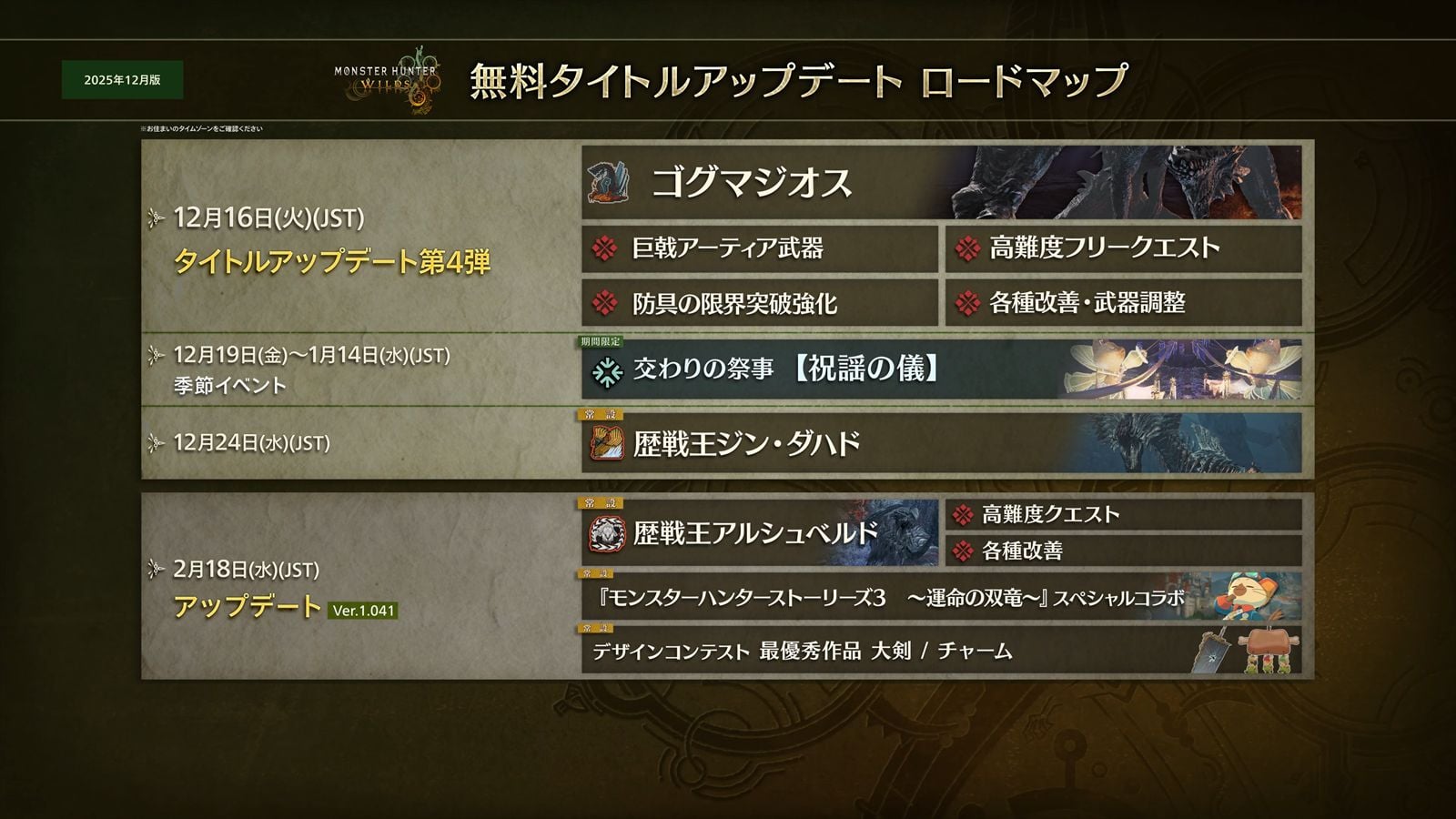 まず、12月16日のタイトルアップデート第4弾をもって『モンスターハンターワイルズ』での新たな追加モンスターを含む大型アップデートは最後となる。今後はSteam版の安定度の向上を目的としたパッチ配信が予定されているほか、2026年2月18日には新コンテンツを含む最終アップデートが実施される。