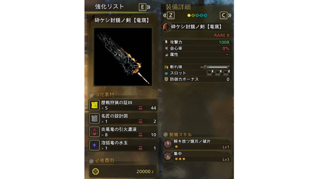 この「砕ケシ封鏡ノ剣【竜窩】」の性能に熱い注目が集まっている。この大剣は攻撃力は1008とほかの生産大剣と比べてもやや控えめながら、武器スキル「集中Lv3」、およびレベル3のスロット3枠を備えている。また、専用の武器スキルとして「解キ放ツ鏡刃ノ破片」を有しており、3段階まで溜めた溜め斬りで一定範囲にダメージを与えられる。