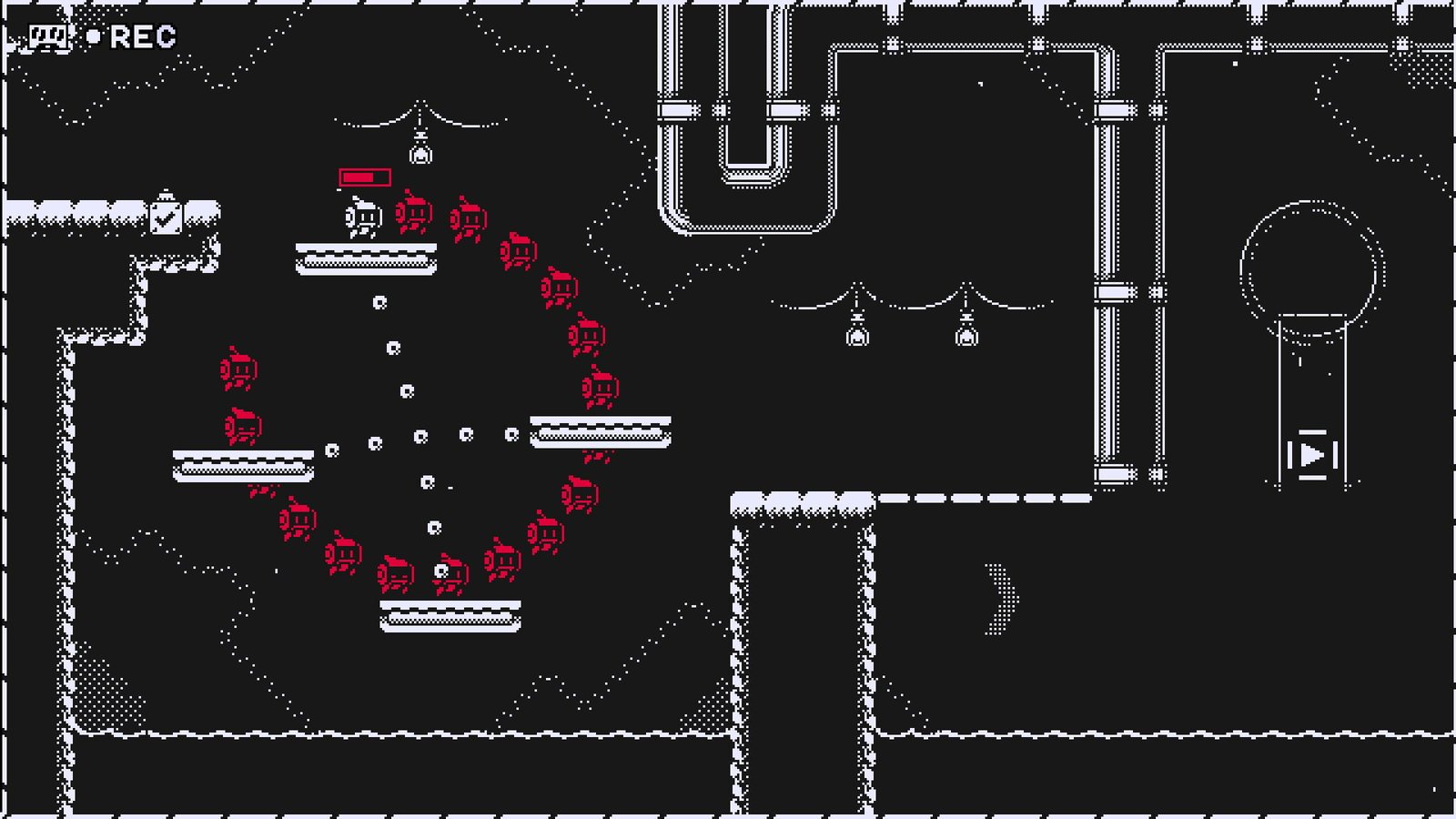 ゲームプレイは基本的に2Dアクションで、移動、ジャンプ、すり抜けられる足場をすり抜けて落ちるといった操作がある。それに加えて、特定のボタンを押し続けたまま移動をおこなうと動きの記録ができる。記録した動きが描く軌道は緑色のラインで表示され、任意の場所で再生することが可能だ。また、再生は好きなタイミングで止めることもできる。長い距離を動いた記録を途中で止めれば、止まりたい場所で止まれるわけだ。ちなみに記録しておける動きは1つだけで、新しく記録した場合は上書き保存となる。突破すべき地形に合わせて次々と記録を乗り換えていくことになるだろう。