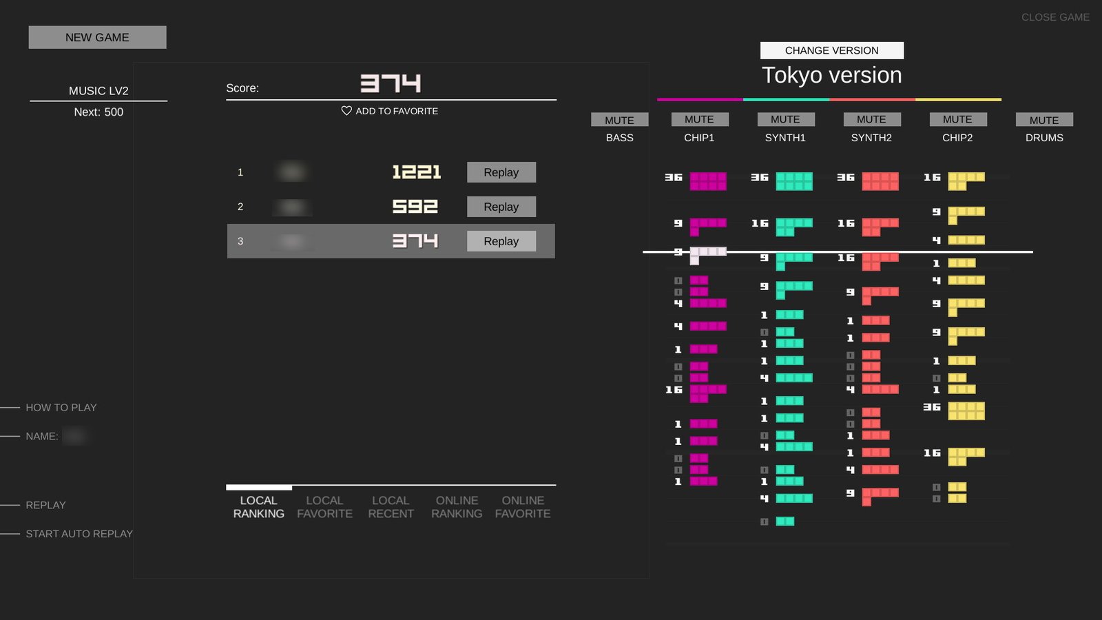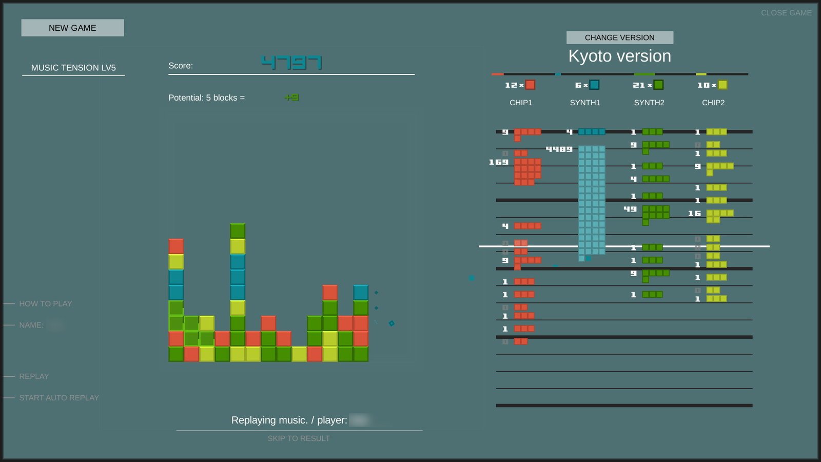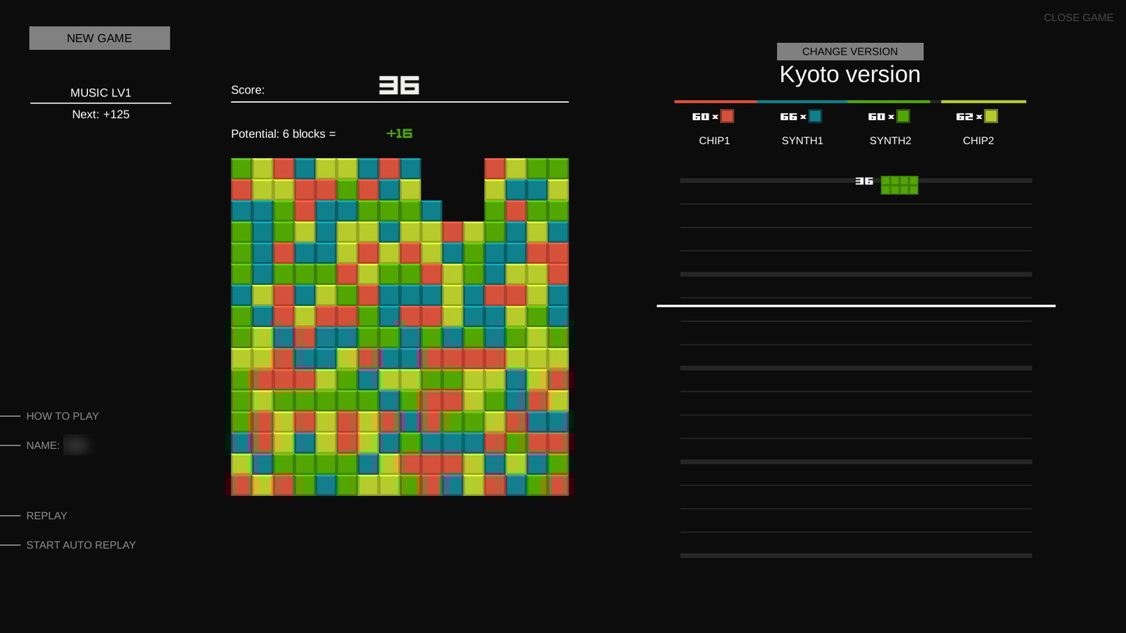 動いているラインがブロック記録を通過すると、消した色と数に応じてそれぞれのパートの音が鳴る。また、1つの色を残してハイスコアが狙える状況に近づくほどパーカッションが入って音楽が少しずつ展開し、大きな塊を消すことで一気に盛り上がる。こうした抑圧と解放の流れの後に、最後に消せるブロックがなくなった時点で「自分の曲」が完成する。