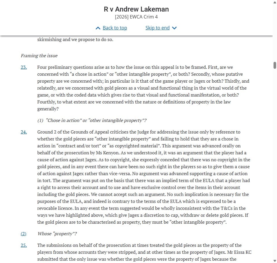 MMORPG『Old School RuneScape』のゲーム内通貨を巡った英国の裁判において、ゲーム内通貨を「盗難の対象となりうる財産」であるとする判断が示され、注目を集めている。