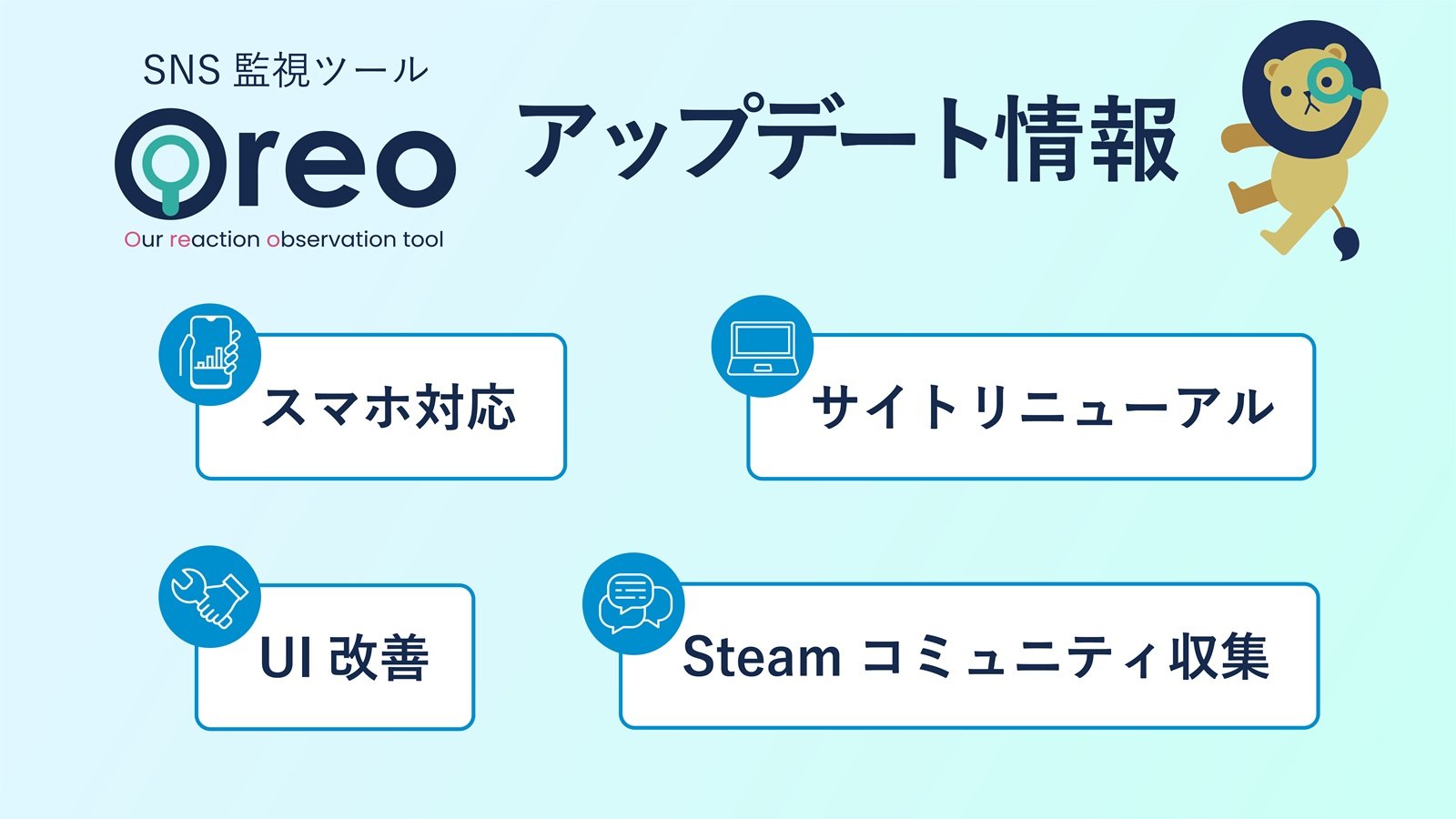SNS監視・分析ツール「Oreo(オレオ)」について、スマホ操作に対応するアップデートが実施された。そのほか、Steamコミュニティの収集にも対応した。