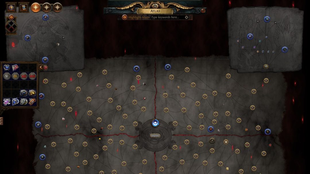 エンドゲームである「アトラス」には、構造の大きな変化が加えられている。今回の変化はエンドゲームの活性化とわずらわしさのある要素を整理・削減を目的としたものとなっている。まず、これまでアトラスでは特定のエリアにアクセスするために、そのエリアのマップアイテムが必要だった。これをTierごとの汎用的なマップアイテムにまとめるかたちで簡素化。たとえば、台地マップにアクセスしたい場合はTier 10のマップアイテムを使用することで突入が可能に。この変化によって、アトラスが進めやすくなることだろう。なお、アトラスの形も変更となり、中心から四隅へと進行するかたちに。四隅にはそれぞれヴォイドストーンスロットが用意されている。