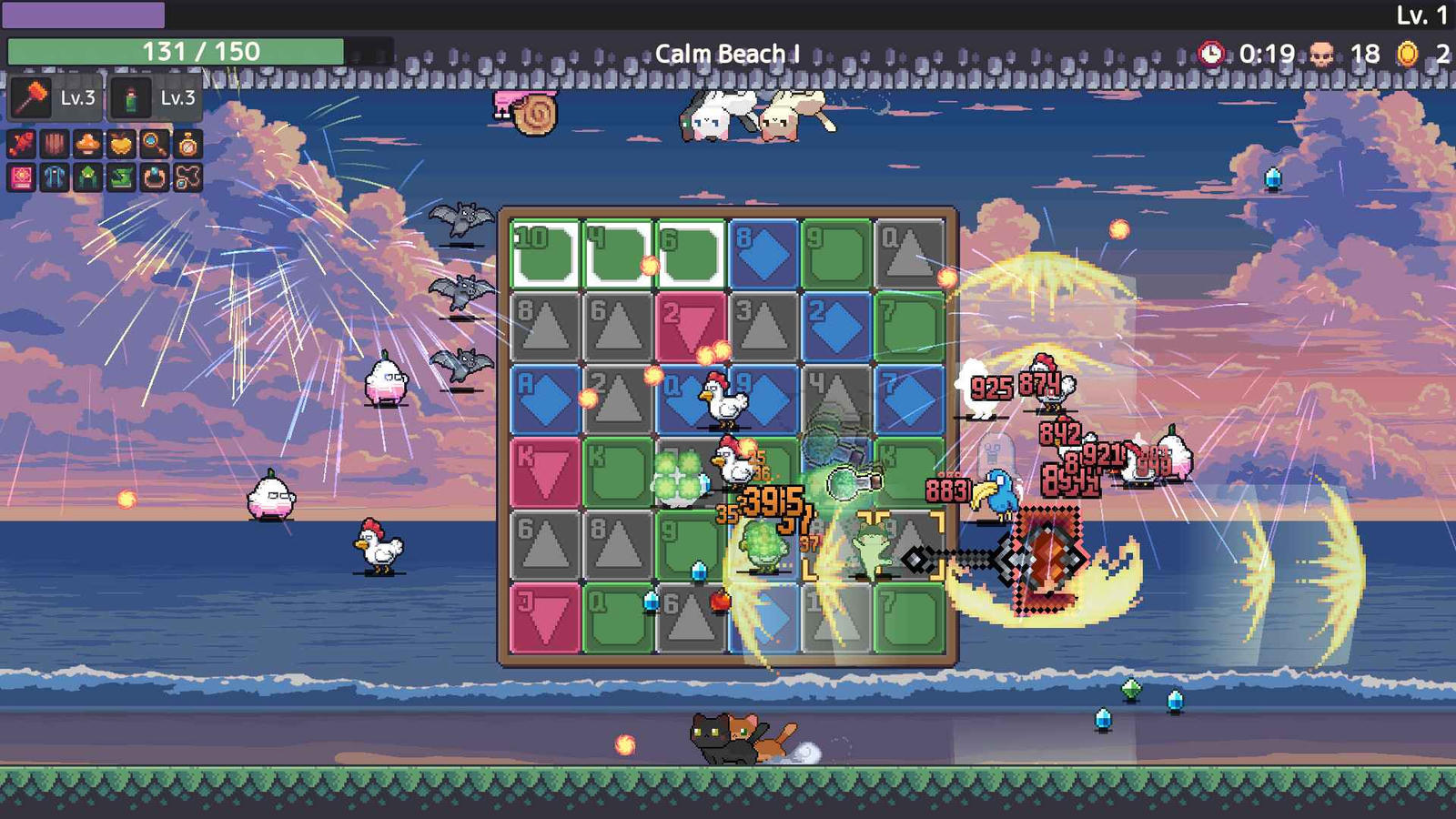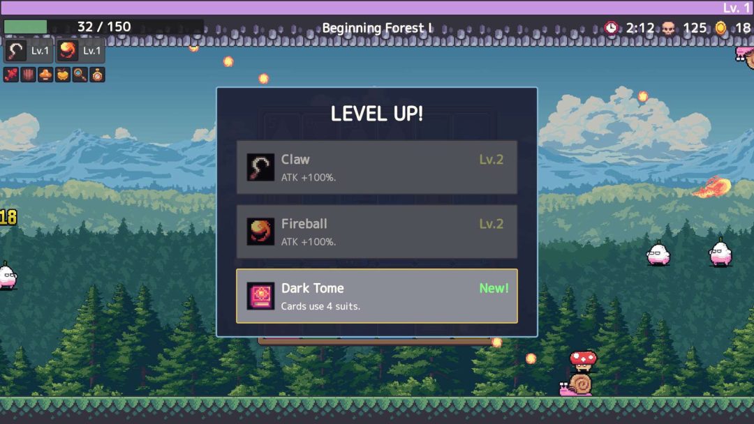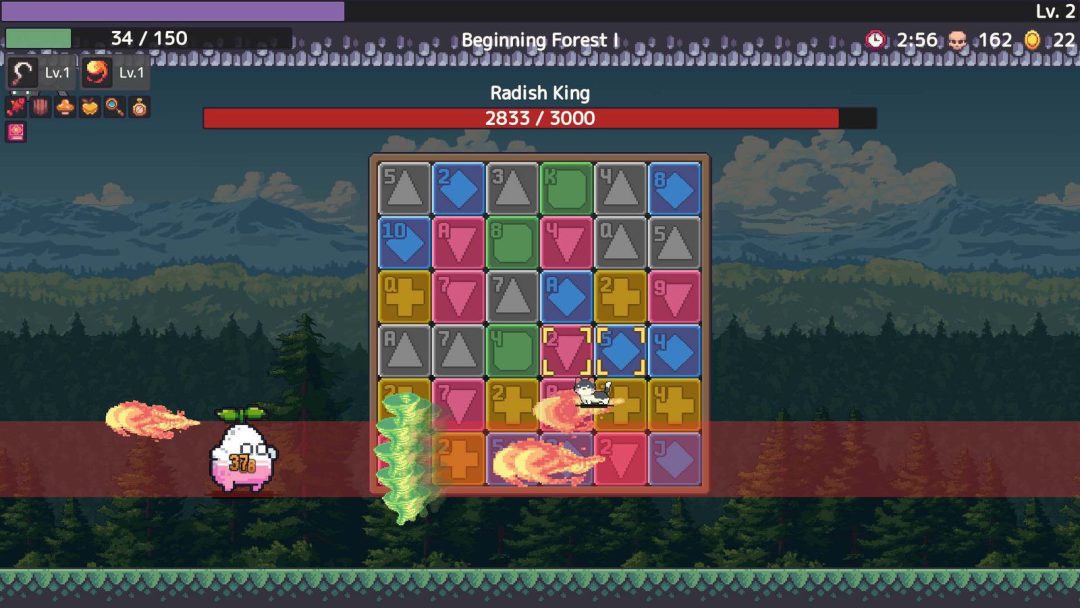 ゲームサイクルとしては、開始時に4種の近接武器と4種の遠距離武器から1つずつ選んで出発。レベルアップによって、3択のパワーアップが表示され、武器やパッシブを強化していく。森、浜辺、雪原、夜の都市という4つのエリアが用意されており、1エリアあたり約15分で 3体のボスが立ちはだかる。エリアのクリア後にはコインで装備を購入する強化要素もあるようだ。敵の攻撃を避けながらマッチ3パズルの連鎖とポーカー役を狙い、毎回異なるビルドを構築し、全12体のボス撃破を目指すのだ。