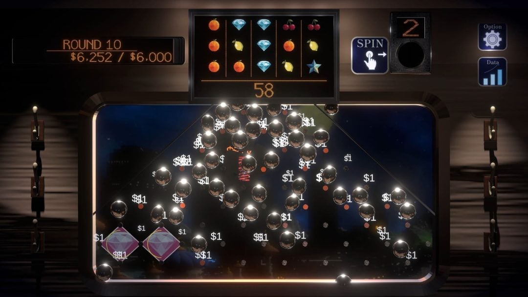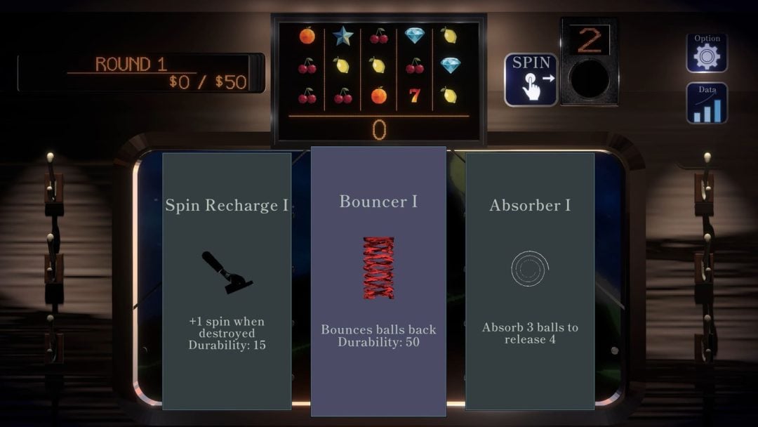 本作では、まずスロットを回し、そこで排出された玉がパチンコ部分に落下する。そして釘の間で玉が跳ねたりしたタイミングでスコアが加算。その得点によって電車が動く仕組みだ。目標額を獲得することで、次のラウンドに進めるようだ。またスロットを回す際には、3つの選択肢からアイテムを一つ選択することが可能で、スロット側のシンボル排出確率を変化させる効果を得られるものや、パチンコ玉を跳ね返す「バウンサー」といった釘の間に設置できるアイテムが用意されている。