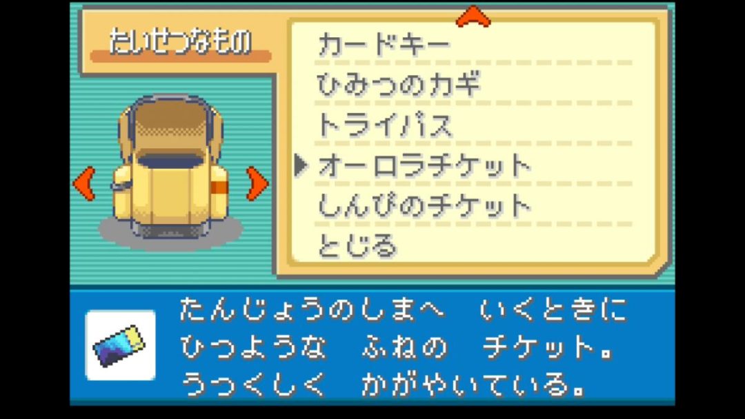 その要素とは、「オーロラチケット」「しんぴのチケット」がゲーム内で入手できるようになったことだ。「オーロラチケット」はデオキシスが出現する「たんじょうのしま」、「しんぴのチケット」はルギアとホウオウが出現する「へそのいわ」に行くために必要なアイテム。これらのアイテムは、エンディングを見た後でゲームを続きからプレイするといつの間にかバッグの「たいせつなもの」に追加されている。
