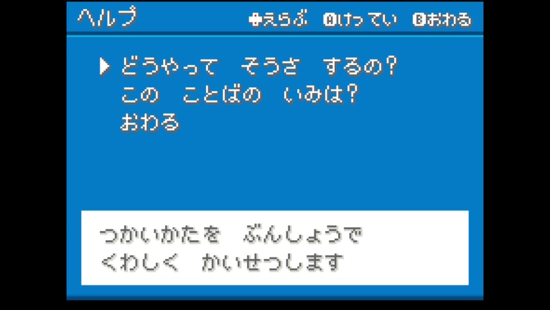 その方法とは、ポケモンの捕獲成功時にLまたはRボタンを押してヘルプを開き、即座にヘルプを閉じるだけ。これによりジングルが流れるのを中断し、すぐに操作可能な状態にすることができる。本作では、LまたはRボタンを押すことでヘルプ画面を表示する機能がある。