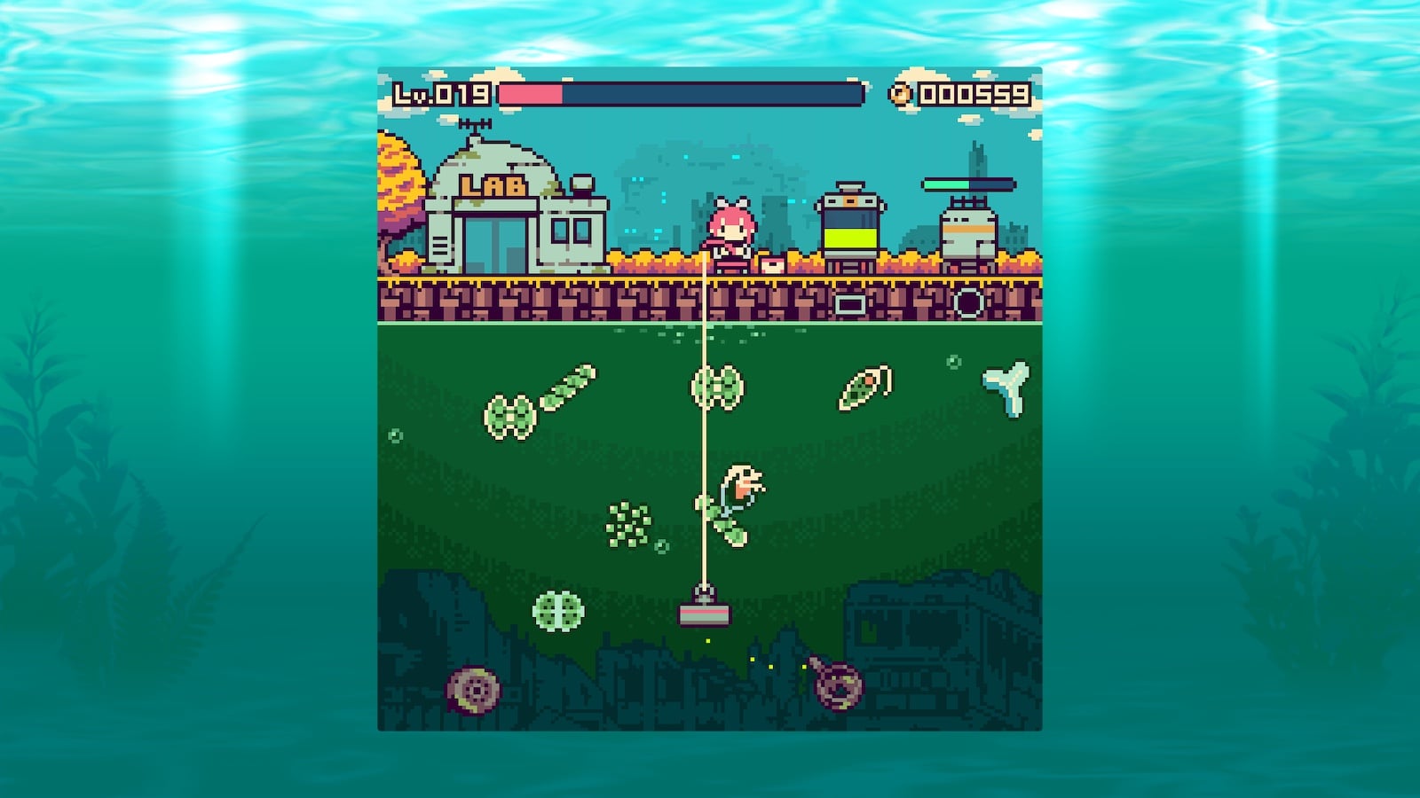 微生物の回収をおこなう一方で、リース自身はガラクタ釣りをする。釣竿とマグネットを使って流れてきたガラクタをサルベージすると、コインに換金。そのコインで設備をアップグレードできる。マグネットの強化や、先述した自動給餌器・自動回収タンクのアップグレードをおこなえるようだ。