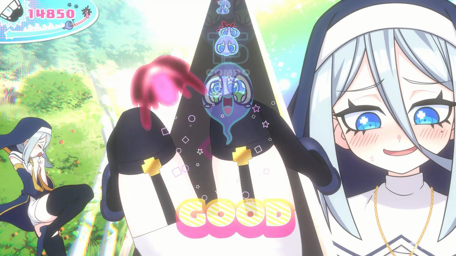 本作の基本操作は、「挟む」と「蹴る」の2つのアクション。画面奥からリズムに乗って流れてくる3種類のターゲットに、対応するそれぞれのアクションで対処していく。飛んでくるタマシイは太ももでやさしくキャッチし、ウイルスはキックして撃退。そして可愛いネコが流れてきたら、挟むを長押しして愛でてあげるのだ。