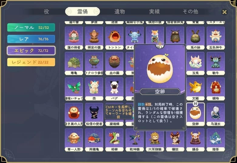 新DLC「蛇と馬の新章」では、魖、傀、魇、魅、日遊神、夜遊神、泰山王という7人の追加キャラクターが実装される予定だ。これらの新キャラクターは固有スキルを有しており、自分で操作する以外に、ライバルとして登場する場合もあるという。また、組み合わせて戦略を生み出す「霊俑(れいよう)」も新たに40体が追加される。例えば、「空卵」という新霊俑の場合は、対局終了時に5分の3の確率で破壊され、ランダムな祭壇を1個獲得できるという特性を有している。