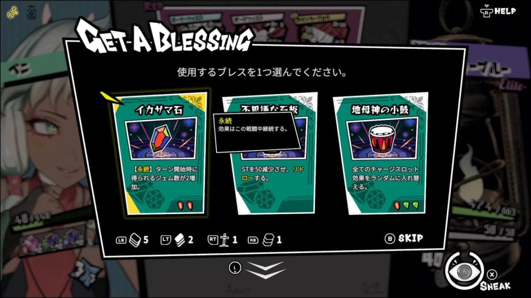 ルートを選びながらダンジョンを攻略していく過程では、本作では新しいスキルとの入れ替えや強化ができる。スキル発動に必要なジェムの色変更も可能。「ブレス」と呼ばれる強化要素では、配られるジェムの増加といった効果も獲得できる。いくつかの強化要素によって、デッキの強化を進めながらダンジョンの攻略を進めていく。