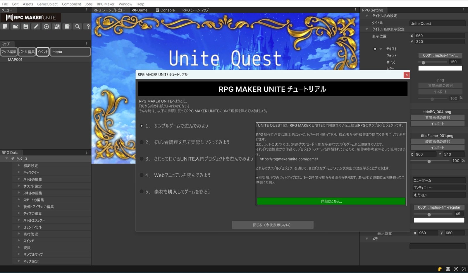 今回Gotcha Gotcha Gamesは、そんな本ツールにチュートリアル「さわってわかるUNITE入門」を導入したと発表。「RPG MAKER UNITE」内に収録されているサンプルゲームのRPGをプレイしつつ、ゲーム制作の基本を学ぶことができるようだ。同チュートリアルは本作の最新バージョンを起動した際に同時に起動され、利用できる。