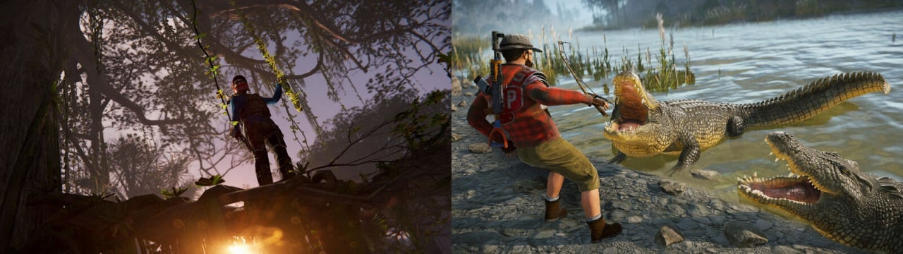 なお危険は木々のなかだけではなく、川のなかにも存在するようだ。川で見つかるワニの索敵範囲は狭く、動きも鈍いが極めてタフな生物だと説明されている。装備が整っていない場合は、お互いのテリトリーを尊重しあうのが賢明だろう。