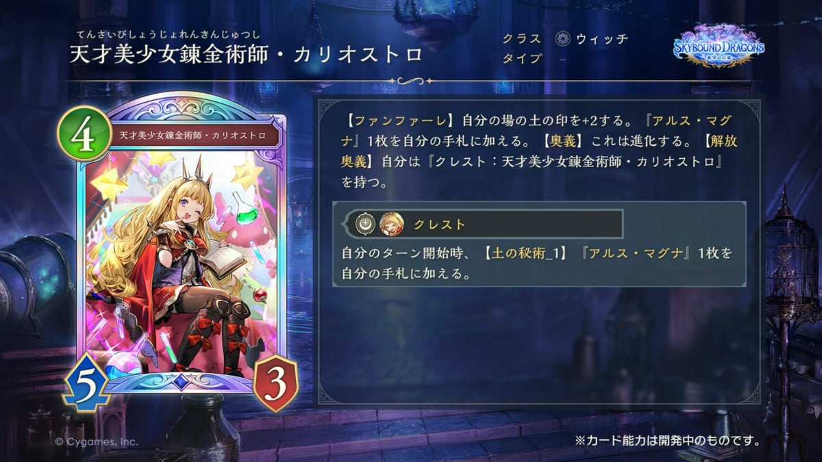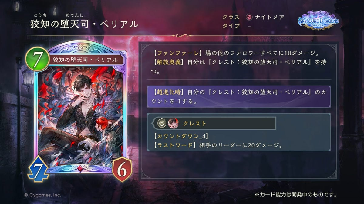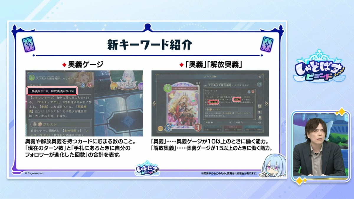 放送内では、ウィッチクラスのカード「天才美少女錬金術士・カリオストロ」、ナイトメアクラスの「狡知の堕天司・ベリアル」、ネメシスクラスの「全一の王・ベルゼバブ」、ニュートラルクラスの「天司長の後継・サンダルフォン」など、レジェンドのカードを中心に多数が紹介されている。また新キーワードとして、ターン数と手札にあるときに自フォロワーが進化した回数に応じて貯まる「奥義ゲージ」、奥義ゲージによって発動する「奥義」「解放奥義」も導入となる。なお、第4弾カードパックのニュートラルクラスのレジェンドは、サンダルフォンのみとなるそうだ。