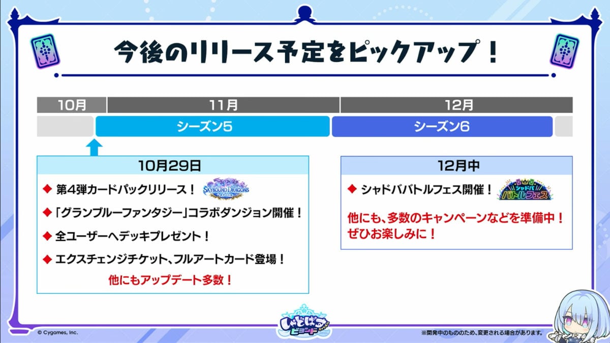 放送では、第4弾カードパック「Skybound Dragons / 蒼空の六竜」が発表された。今回のカードパックは、Cygamesより配信中の『グランブルーファンタジー』とのコラボパックになる。収録カードは、すべて『グランブルーファンタジー』のキャラクターなのだという。