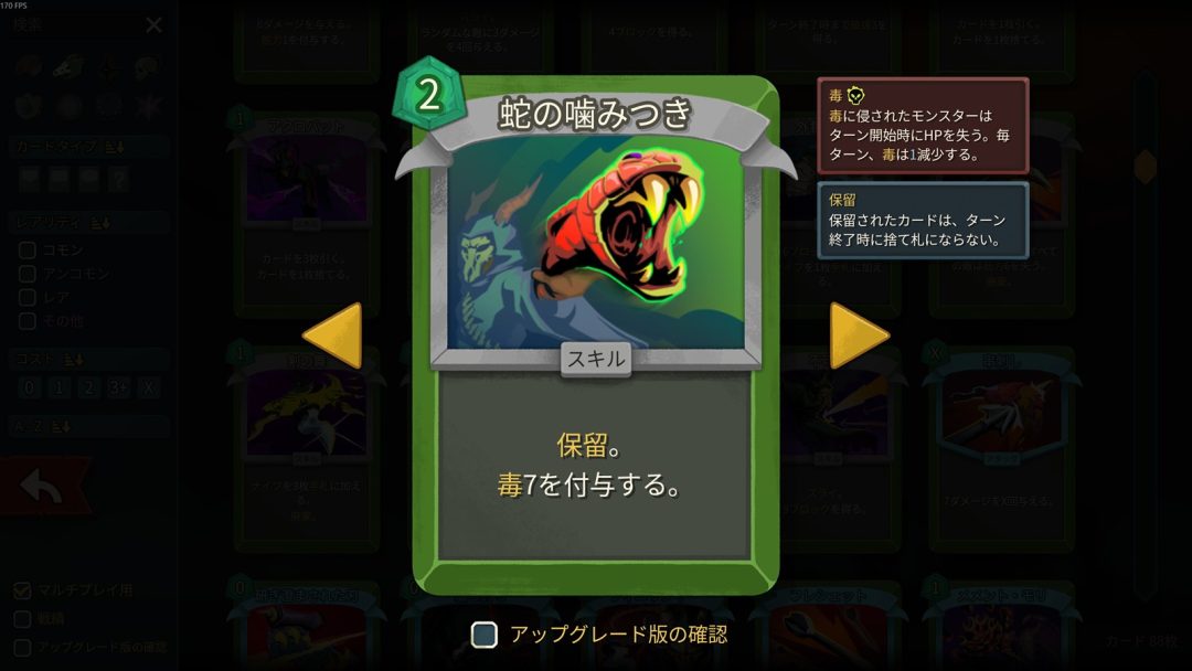 このように「蛇の噛みつき」は、使用ターンのダメージ量では「毒の一刺し」に劣り、「致死毒」と比べても付与できる毒の量に大差がないにも関わらずエナジー効率の面で見劣りしている。競合カードたちと比べて、ステータスの面でパッとしないというのは事実だ。