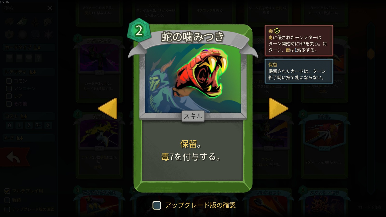 そんな本作の“最弱候補”として現在Redditで注目を集めているのが「蛇の噛みつき」だ。「蛇の噛みつき」は、サイレントで手に入るコモンのスキルカード。2エナジーで「保留。毒7を付与する。」という効果を持っている。「保留」とは、ターンエンド時までプレイしなかった場合でも、捨てずに手札に保持できるという特性だ。なおアップグレードすると毒7が毒10へと上昇。毒を受けた敵はデバフ状態となり、ターン開始時に毒のスタック分のHPを失う。その際に毒のスタックも1減少するが、継続的に付与していけば毎ターン大量のHPを削り取ることが出来る。サイレントにおける代表的なデッキ戦術の1つだ。