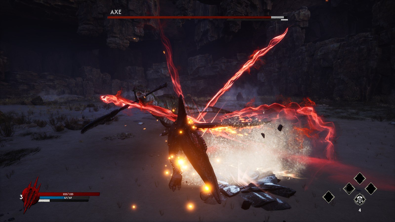 今回配信されたデモ版は、峡谷を舞台に、剣戟アクションや複数のボスとの戦闘、スキルやステータスの成長要素を体験できる1時間程度の内容だ。戦闘ではロックオンした敵の攻撃を防御やローリングで回避しながら、攻撃やスキルを当てていく。敵の攻撃は追尾性が高く強力で、こちらが攻撃中にも反撃を受ける可能性がある怯みの見極めも重要。スタミナ管理や敵との距離感も重要になるソウルライクなゲームプレイだ。
