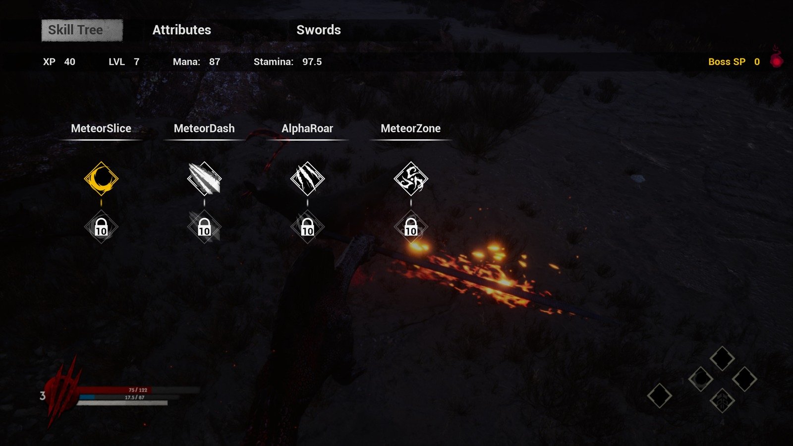 また成長要素として、敵を撃破することで獲得できる「SP」を使い、体力・攻撃力・スタミナなどの基本ステータスを強化できる。加えて、ボス撃破で得られる経験値を消費して、高く跳びあがる連撃「Meteor Slice」、周囲の敵を恐怖させる「Alpha Roar」といったスキルを解放可能だ。さらに、メニュー内には「Swords」の項目があり、装備変更の実装が示唆されている。本編では自分の戦闘スタイルに応じた武器選択・カスタマイズが行えそうだ。