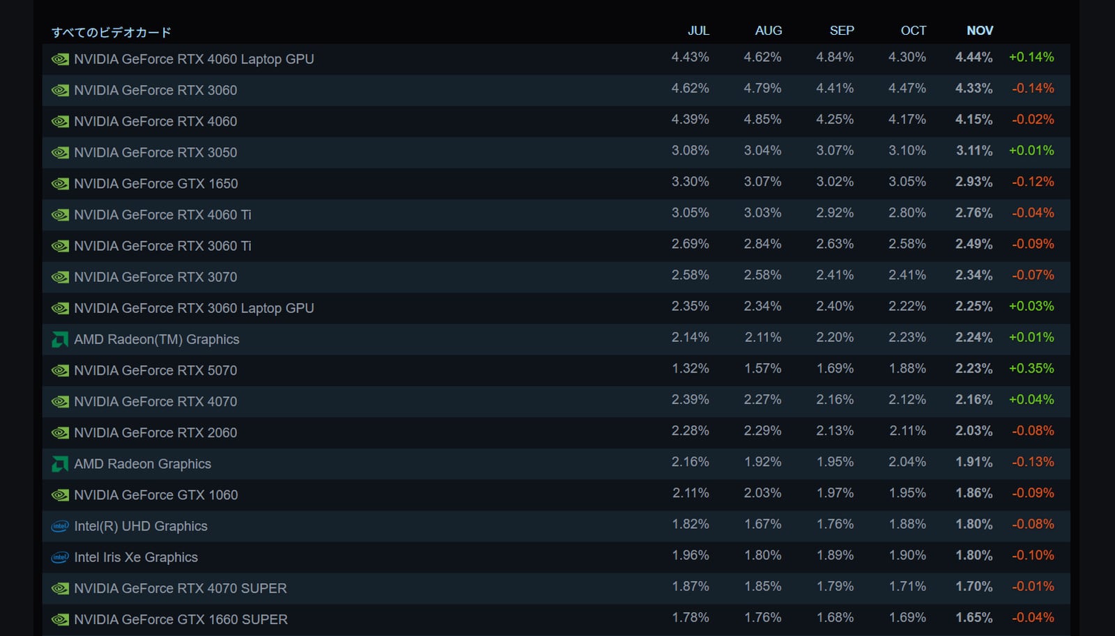なおそのほかの50シリーズも、上位帯にこそないものの上昇幅は大きく、「GeForce RTX 5060」は前月比+0.32%で使用率1.62%、「GeForce RTX 5060 Ti」は前月比+0.21%で使用率1.20%と続いている。年替わりを前に、30シリーズや40シリーズからの移行が着々と進んでいることも伺える。これら製品が位置するミドルクラスは、前世代において売れ筋のラインであり、今後一気に上位に食い込んでくる可能性も高いだろう。