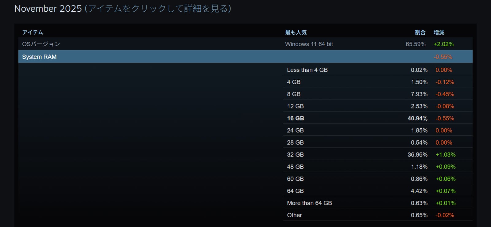 ほかにも11月の調査では、32GB以上のメモリを搭載するユーザーの割合が上昇していることが見受けられる。現在では16GBが使用率40.9%で一番人気の構成となっているものの、続く32GBは36.96%まで上昇。背景には、より多くのメモリ容量を要求する作品の増加などがあるのかもしれない。とはいえ、直近ではメモリ価格の世界的な高騰が報告されている状況。こうした傾向は2027年ないし2028年頃まで恒久的に継続するとの見方もでている(Tom’s Hardware)。Steamユーザーたちのゲーム環境にはどのような影響を及ぼすのか注視したい。