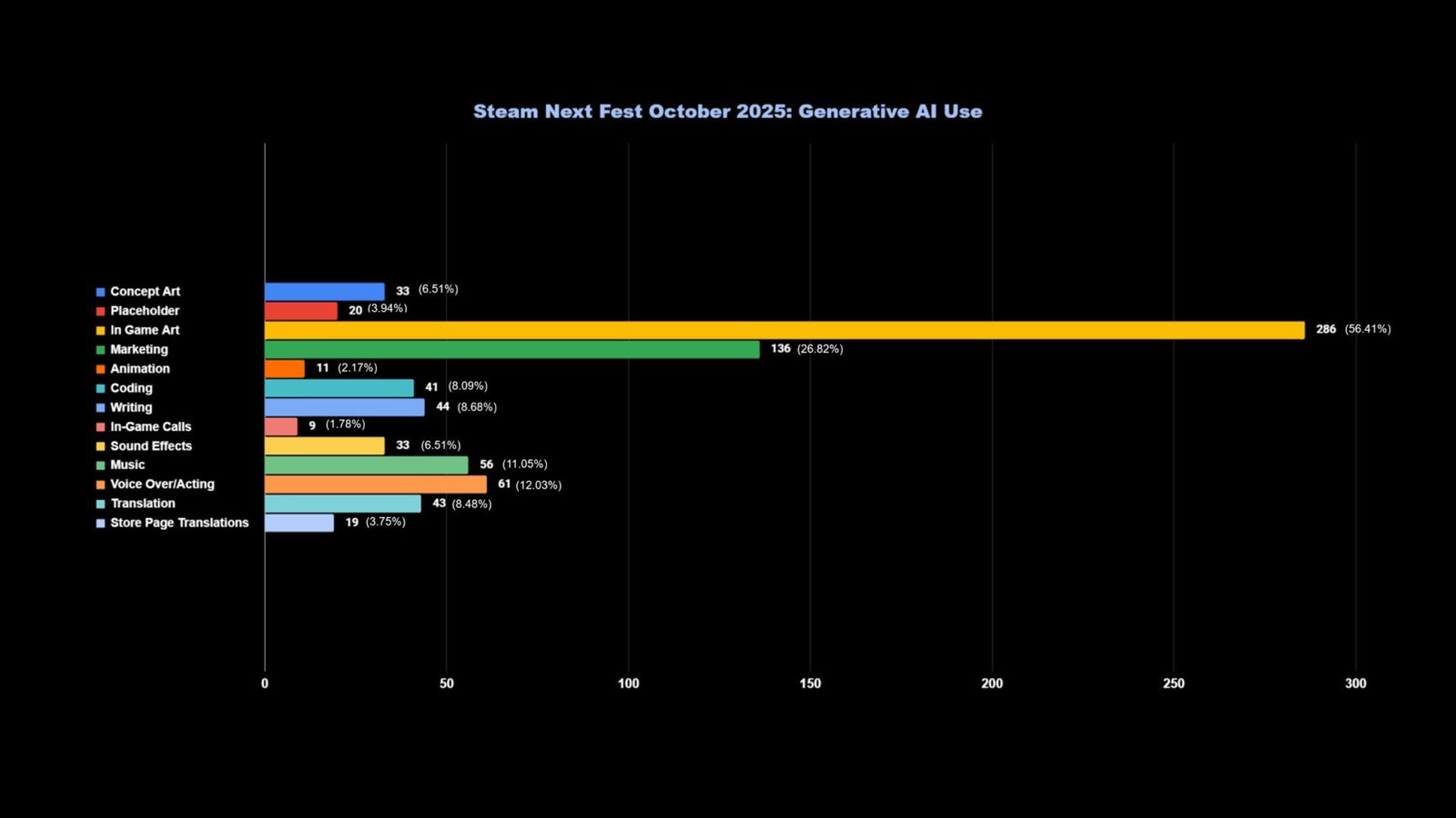 昨今、さまざまな分野で生成AIの活用が進められているが、ゲーム開発も例外ではない。海外メディアのTechRaptorは、ゲーム配信プラットフォームSteamにて10月に実施された「Steam Nextフェス」におけるデータから、同イベントの参加作品におけるAI利用の状況を調査している。